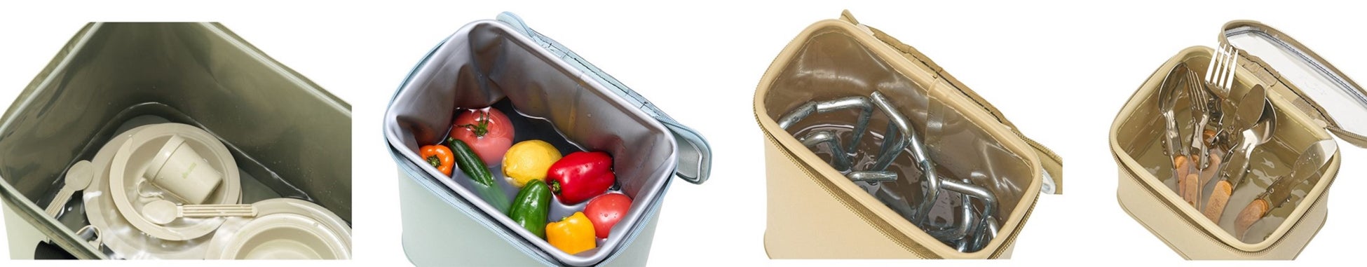 アウターケースに、S・M・Lの3種類の小分けケースを複数組み合わせることで、細かなキャンプ用品をスマートに持ち運びができ、すっきりと収納できます。また、6種類ともすべて防⽔仕様で丸洗いが可能です。⽔をためて⾷器をつけ置いてそのまま洗うこともでき、近くに炊事場がないキャンプ場などでも重宝します。