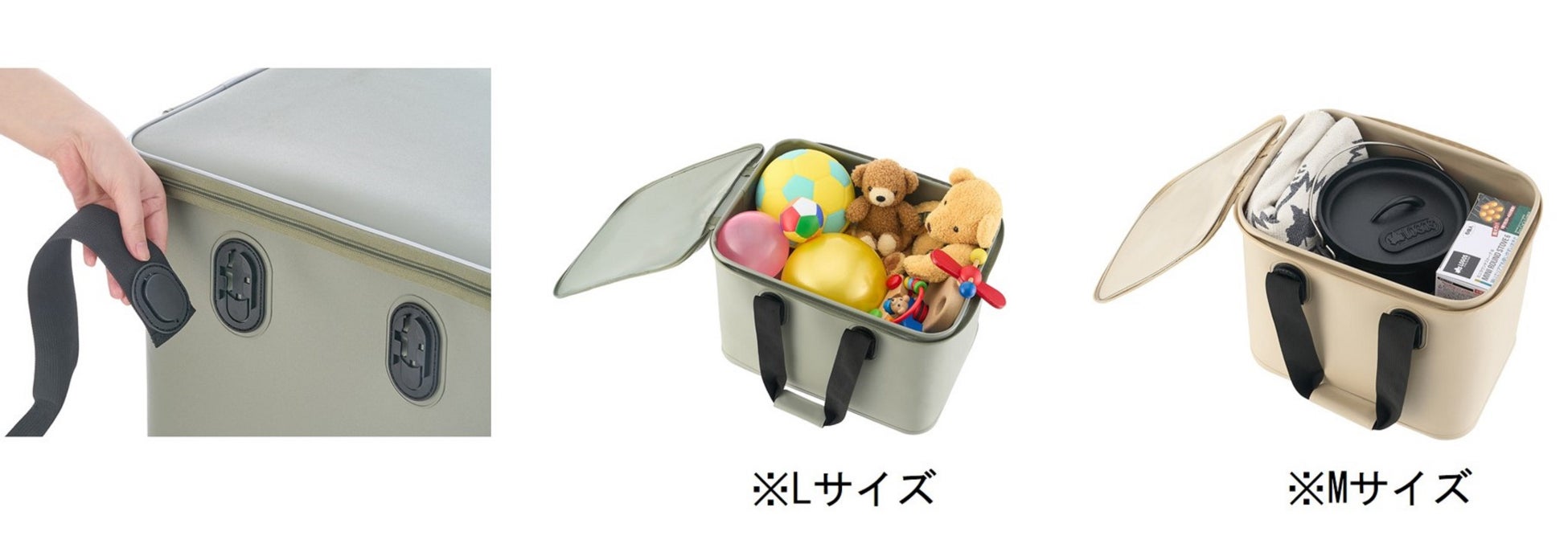 アウターケースは、たっぷり収納できる40Lサイズと、使い勝⼿の良い25Lサイズのラインアップです。丈夫かつ柔らかな素材を使⽤しており、万が⼀お⼦様がぶつかっても衝撃を軽減してくれるため⼦供部屋の収納ケースにも最適で、取り外し可能なハンドル付きのため保管にも便利です。