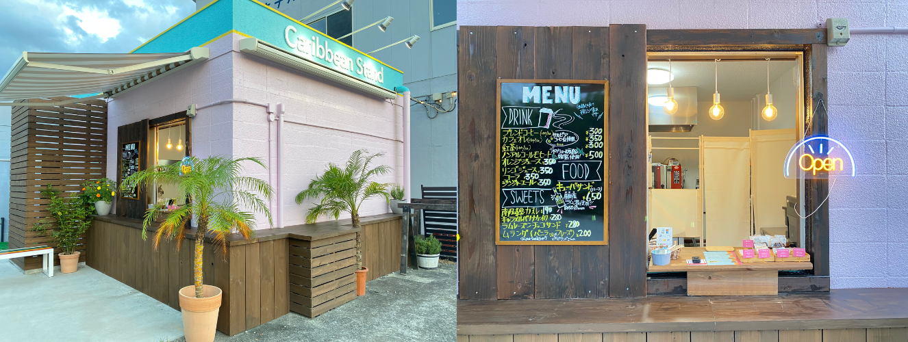 そんな『Caribbean Stand 』の外装はラム酒の名産国であるカリブ海最大の島国、キューバ・ハバナの街並みから着想を得てデザインが決まりました。淡いピンク色を ベースにエメラルドグリーンと黄色を差し色に、今まで南房総では出会ったことのないコーヒースタンドが誕生しました。