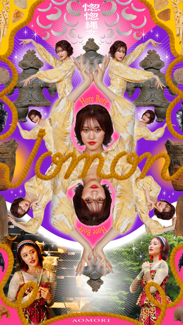 王林さんと⻘森県在住のイラストレーター/デザイナー・豊川茅さんがコラボ!公式Instagram(@horebore_jomon)よりダウンロード可能です。⼟偶や遺跡をモチーフにした開運ポーズを決めた王林さんとインパクト抜群のデザインをお⾒逃しなく!