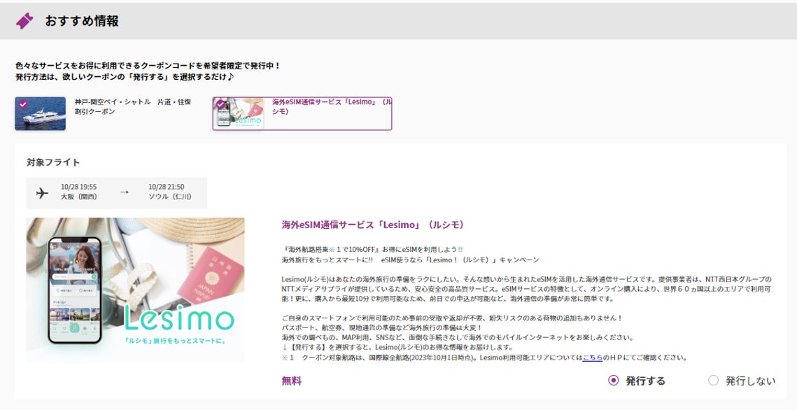 クーポン対象航路は、国際線全航路(2023年10月2日時点)です。「Lesimo」利用可能エリアはこちら(https://www.lesimo-ms.com/price/)にてご確認ください。