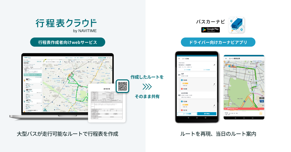 『行程表クラウド by NAVITIME』で予め行程表を作成し、運行ルートを決めます。その行程表に対応する運行指示書にQRコードが発行されます。ドライバーは運行指示書を受け取り、スマートフォンやタブレット端末でQRコードを読み取ることで『バスカーナビ』にルートが連携されます。