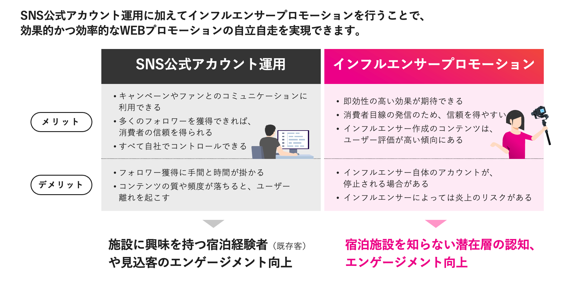 SNS上でインフルエンサーを活用することにより、幅広い潜在層に向けて宿泊施設を訴求することができ、認知とエンゲージメントの向上を計ります。