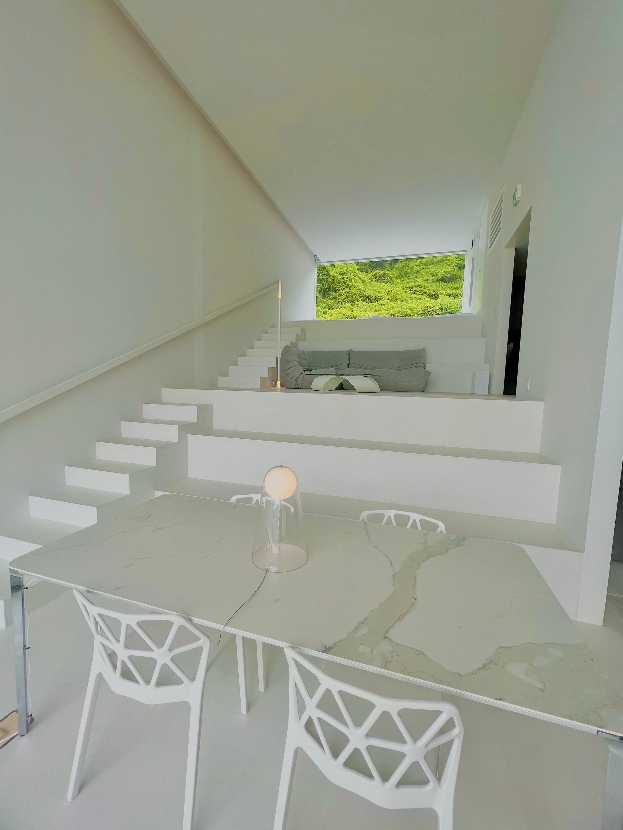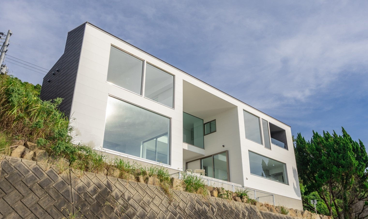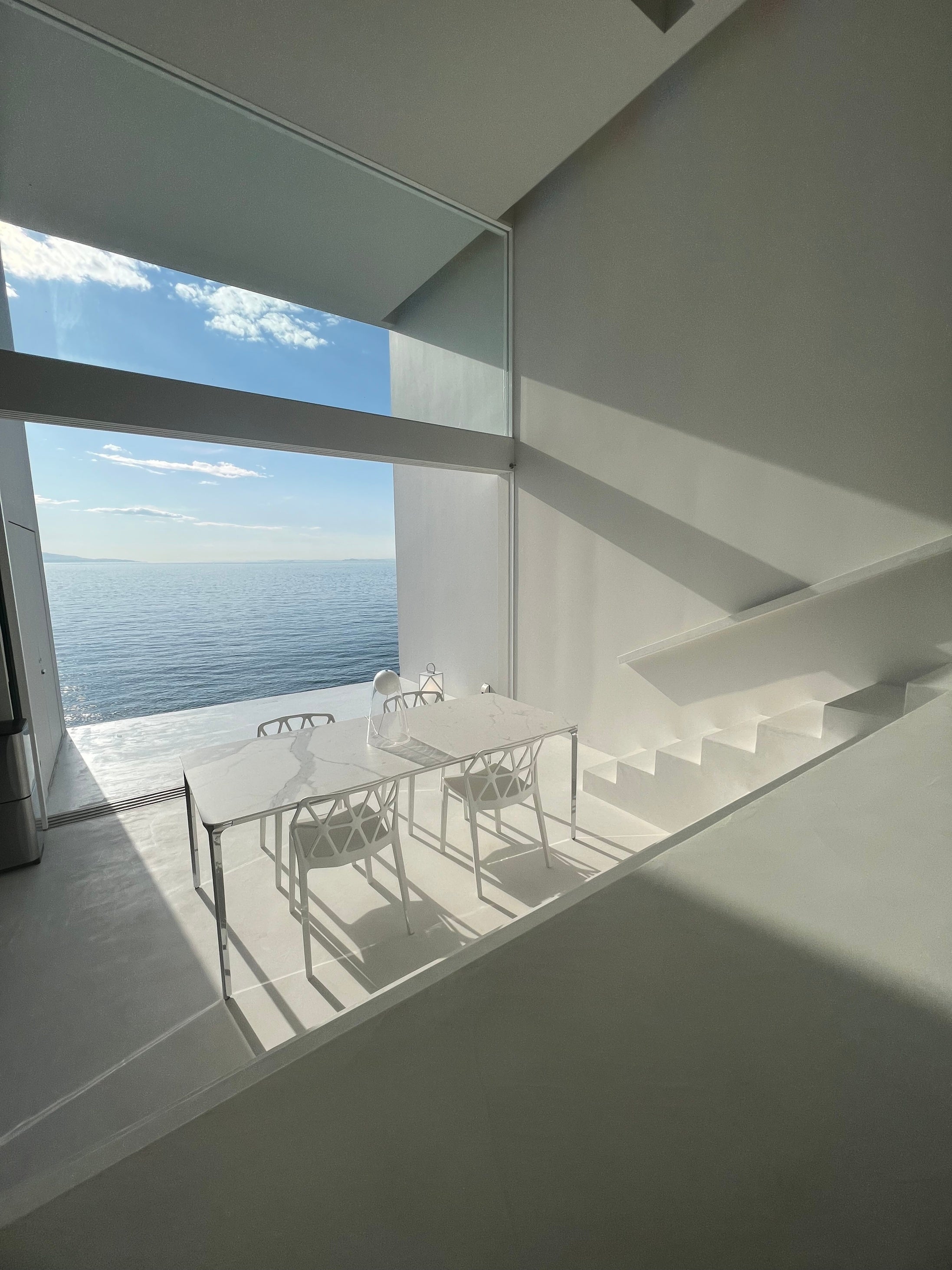 美術館のような真っ白な大空間と、リビング・ダイニング・寝室、どこからでも海と山を楽しめる、大きな窓とテラスが特徴です。