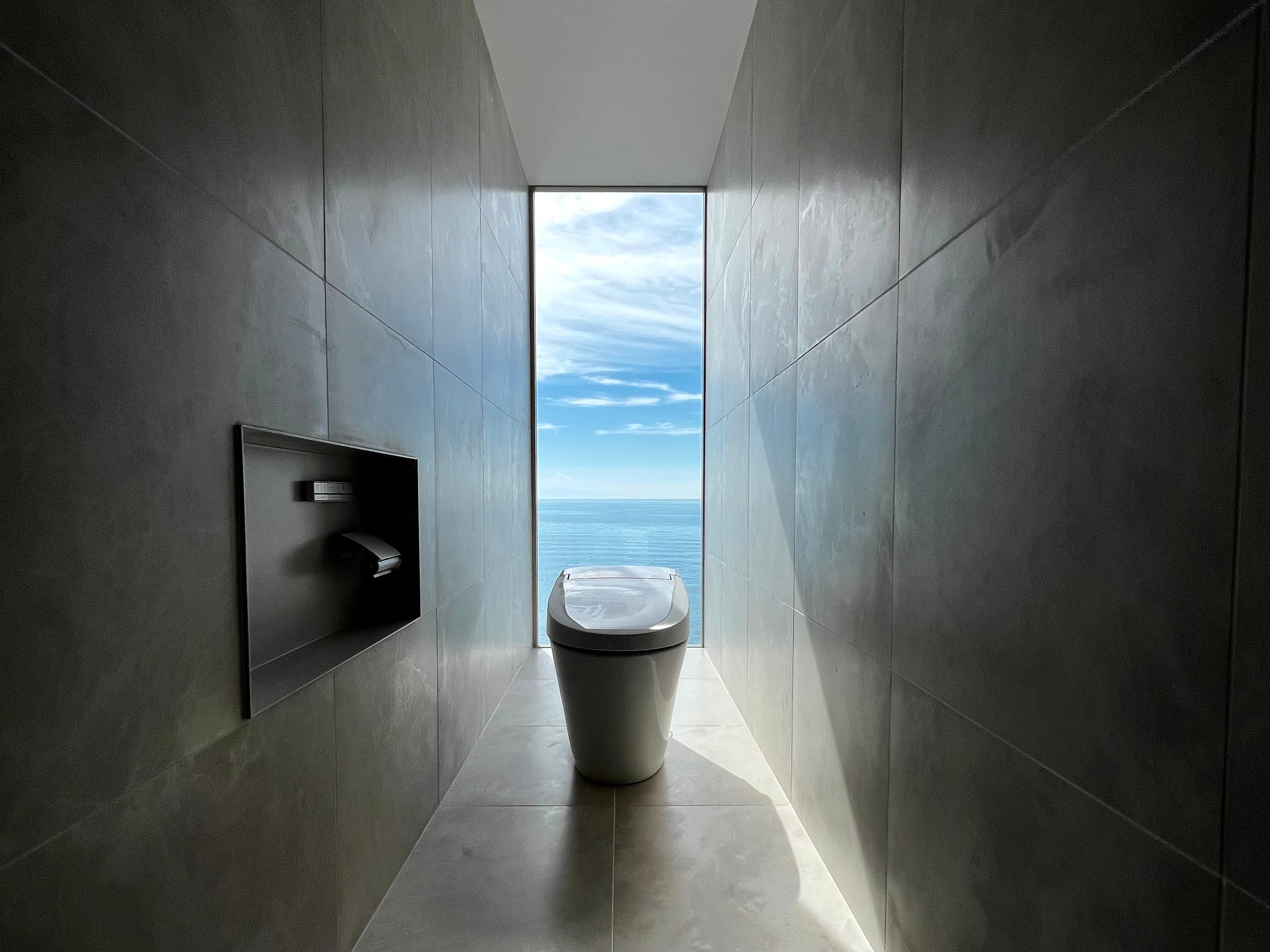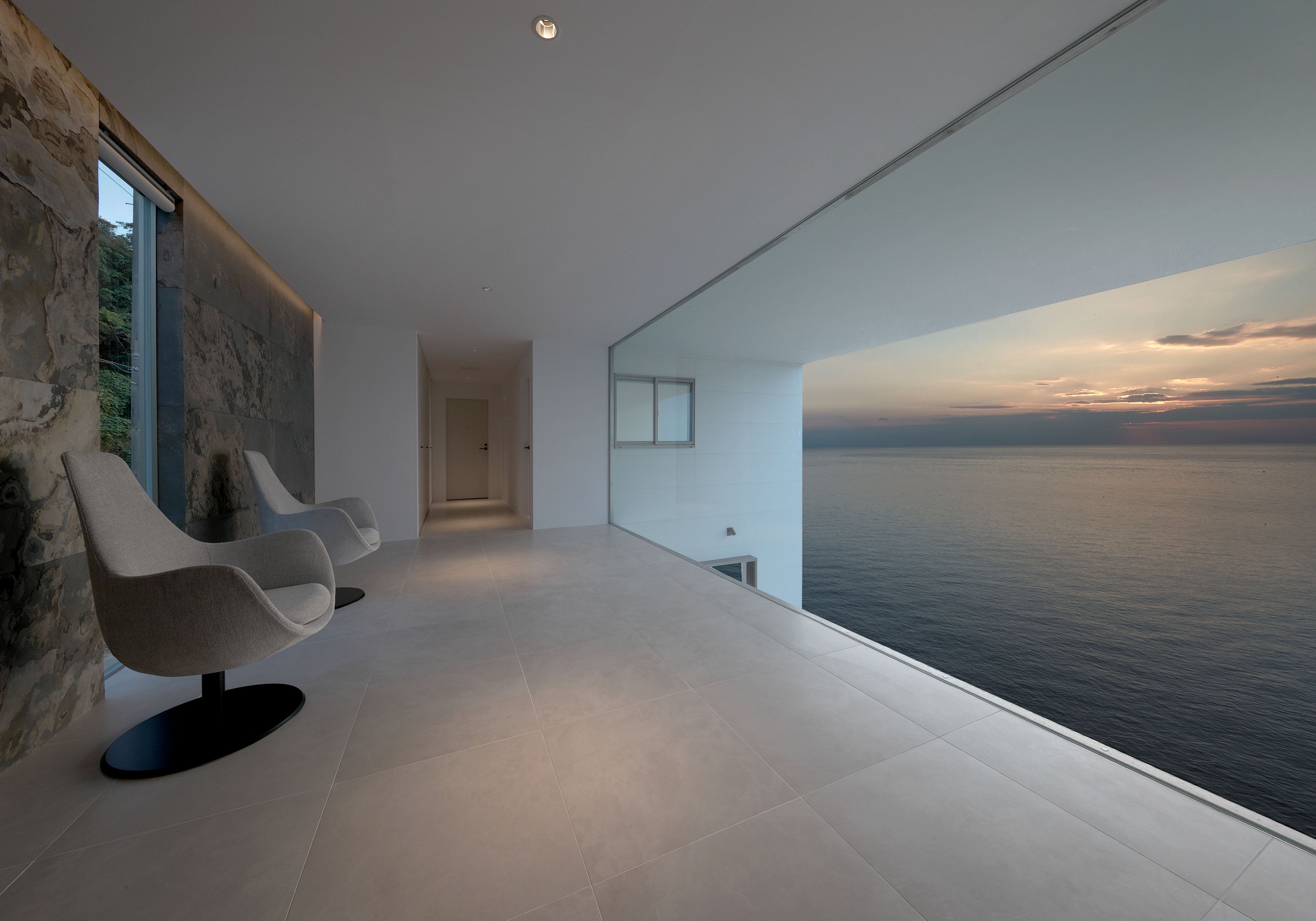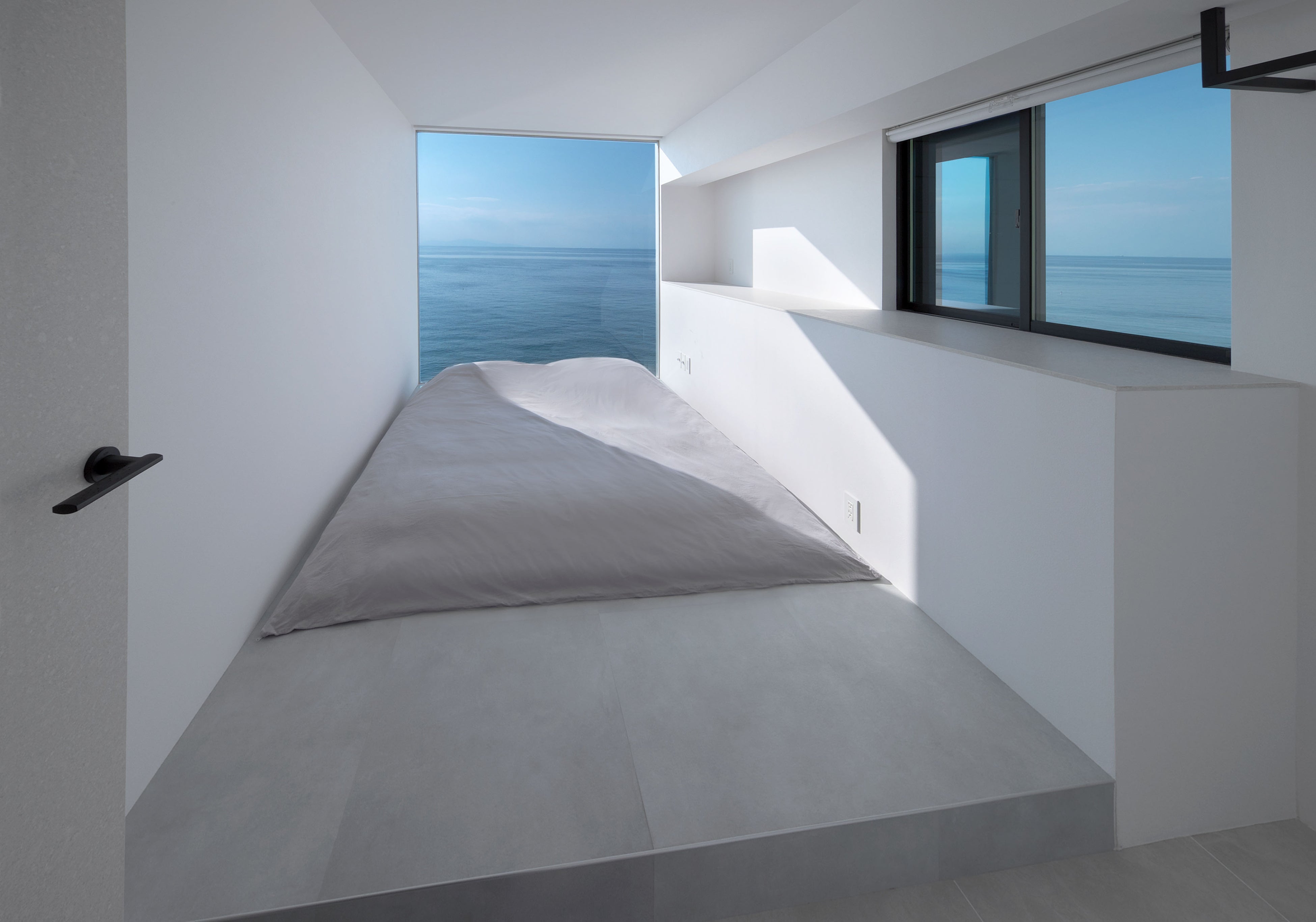 美術館のような真っ白な大空間と、リビング・ダイニング・寝室、どこからでも海と山を楽しめる、大きな窓とテラスが特徴です。