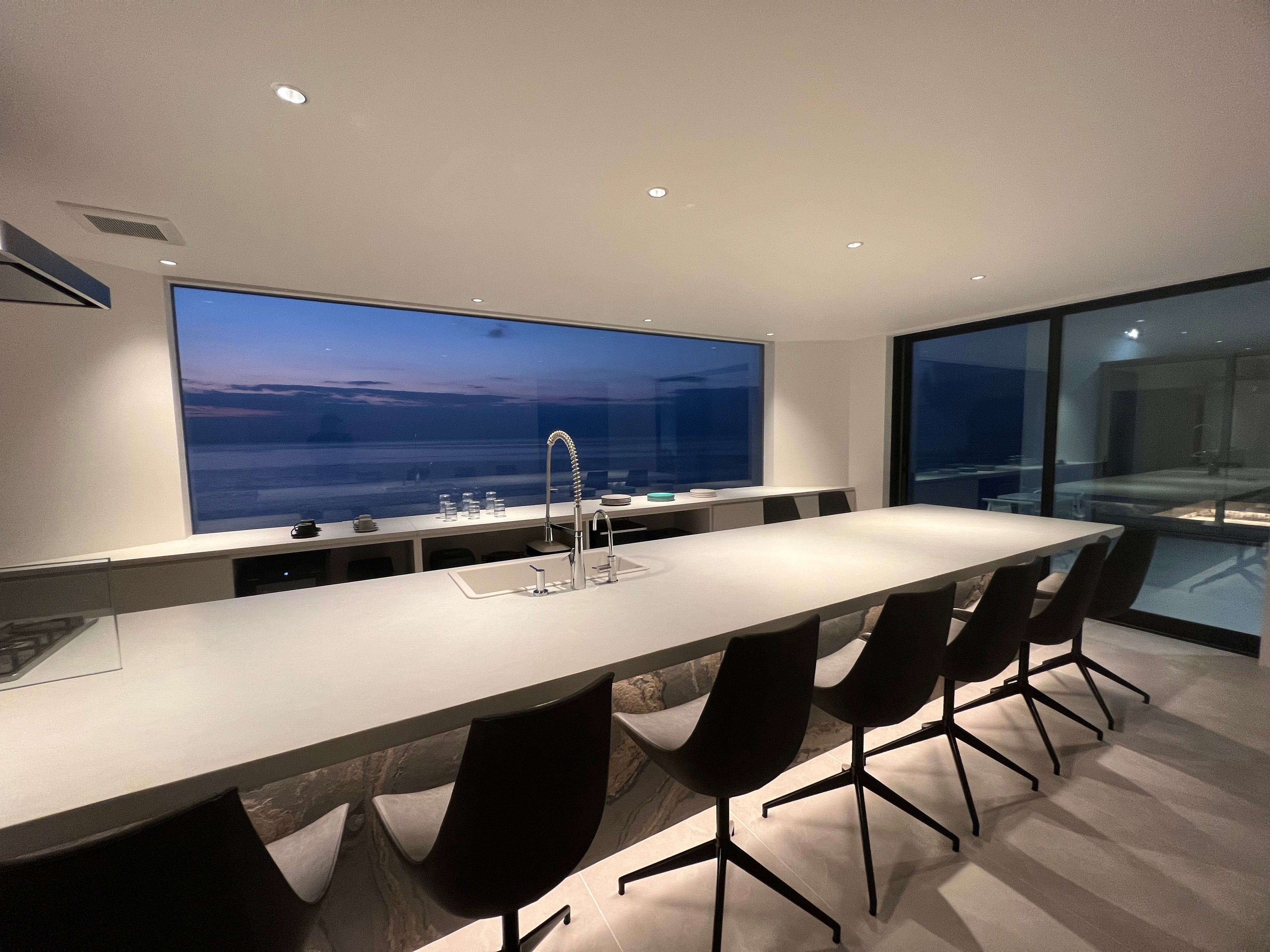 ヴィラの目前には雄大な瀬戸内海、向かいに望む小豆島まで何も遮るものはなく美しい情景がパノラマに拡がる絶好のロケーション。時々刻々と表情を変える海と空、日没時には沈みゆく夕陽で紅く染まる空の茜とが織りなす神秘的で美しい景観をテラスではパノラマ的に、室内では海と空を切り取るように絵画的に、全室、廊下に至るまでどの空間からでもご堪能いただけます。