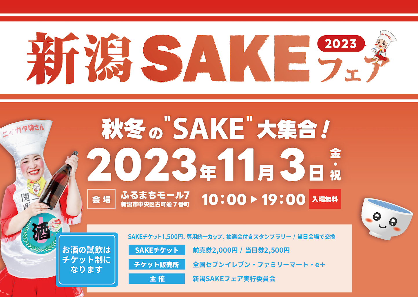 新潟県内の観光や物産を情報発信している新潟県PRキャラクター(非公認)ニイガタ姉さんがプロデュースする県内の日本酒、ビール、ワインなどの「SAKE」を堪能できるイベント。