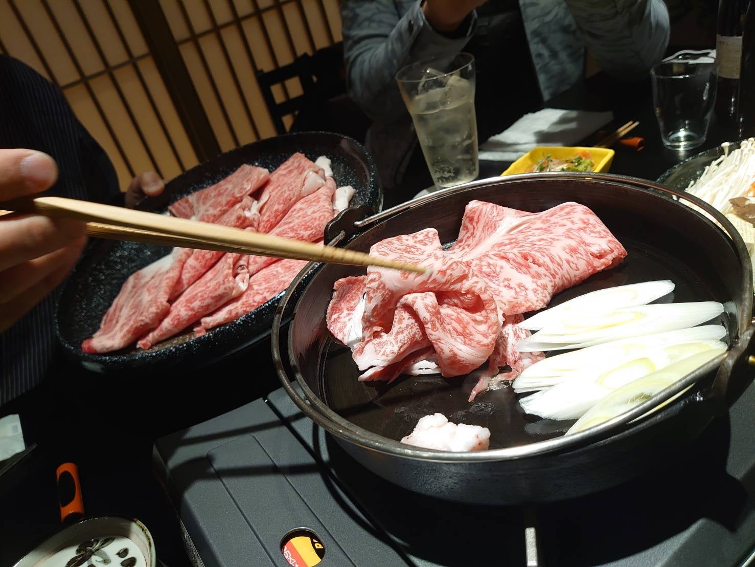 (お通し、スキヤキ、握り寿司、フルーツ)
