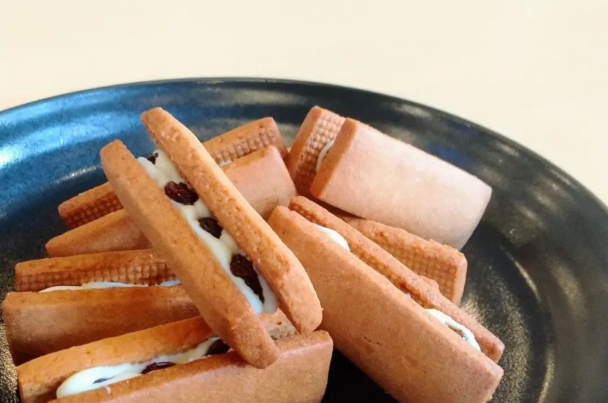 ラムシロップに漬け込んだレーズンとホワイトチョコレートをクッキーでサンド。ちょっと厚めで食べ応えがあるクッキーがラム酒香るレーズンとよく合う。