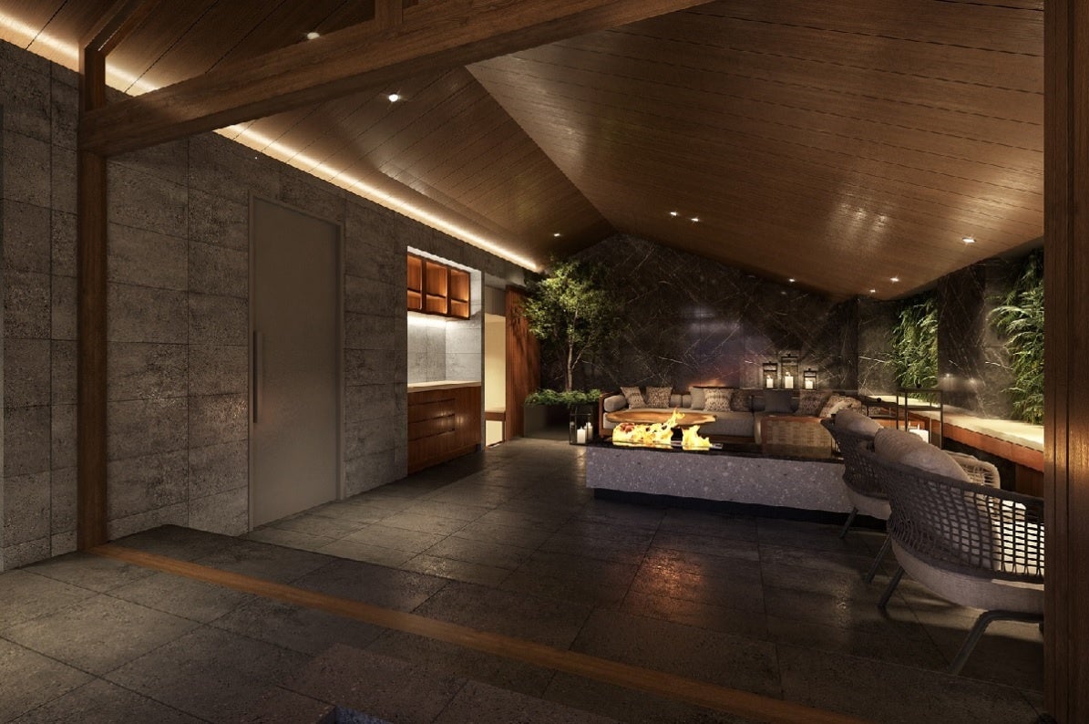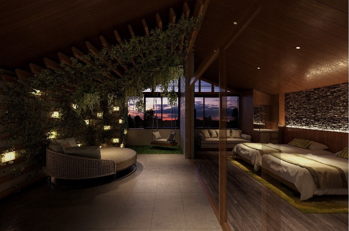 バレルサウナ、アウトドアソファ、ブランコベンチなど、屋外を思わせるしつらえとグリーンに囲まれた空間で、心身の調和を大切にする特別なひとときをお過ごしください。
