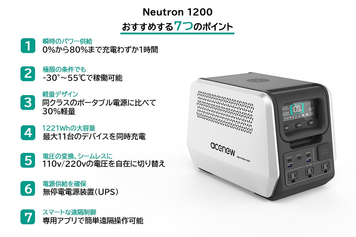 Neutron 1200は、電力不足から解放され、あらゆる場所で電力を持ち運ぶことができるAC1500W出力ポータブル電源です。革新的なテクノロジーが結集し、高速充電によりたった1時間でバッテリー残量80%まで回復します。※PSEマーク表示済み