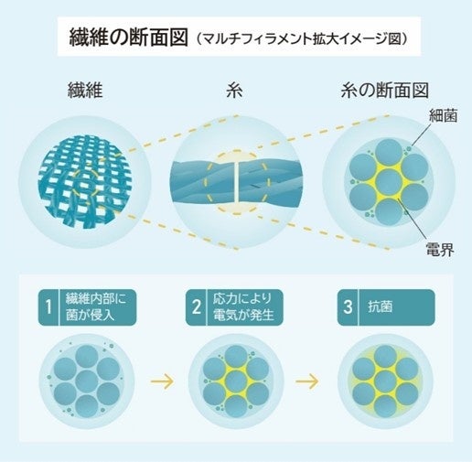 「narifuri × ピエクレックス ポロシャツ」 「narifuri × ピエクレックス カーディガン」 に用いられている「電気の繊維」ピエクレックスは、植物由来の「ポリ乳酸」を原料とした新素材で、伸縮させると微弱な電気が発生して抗菌効果を発揮します。