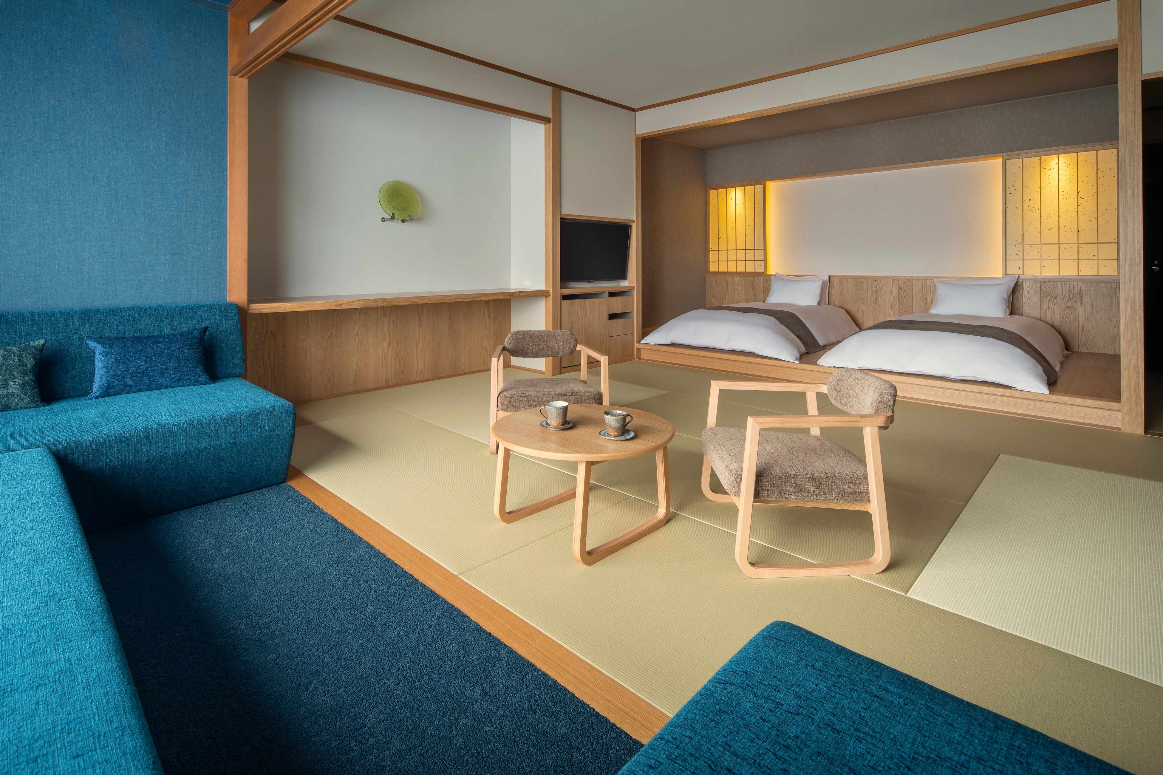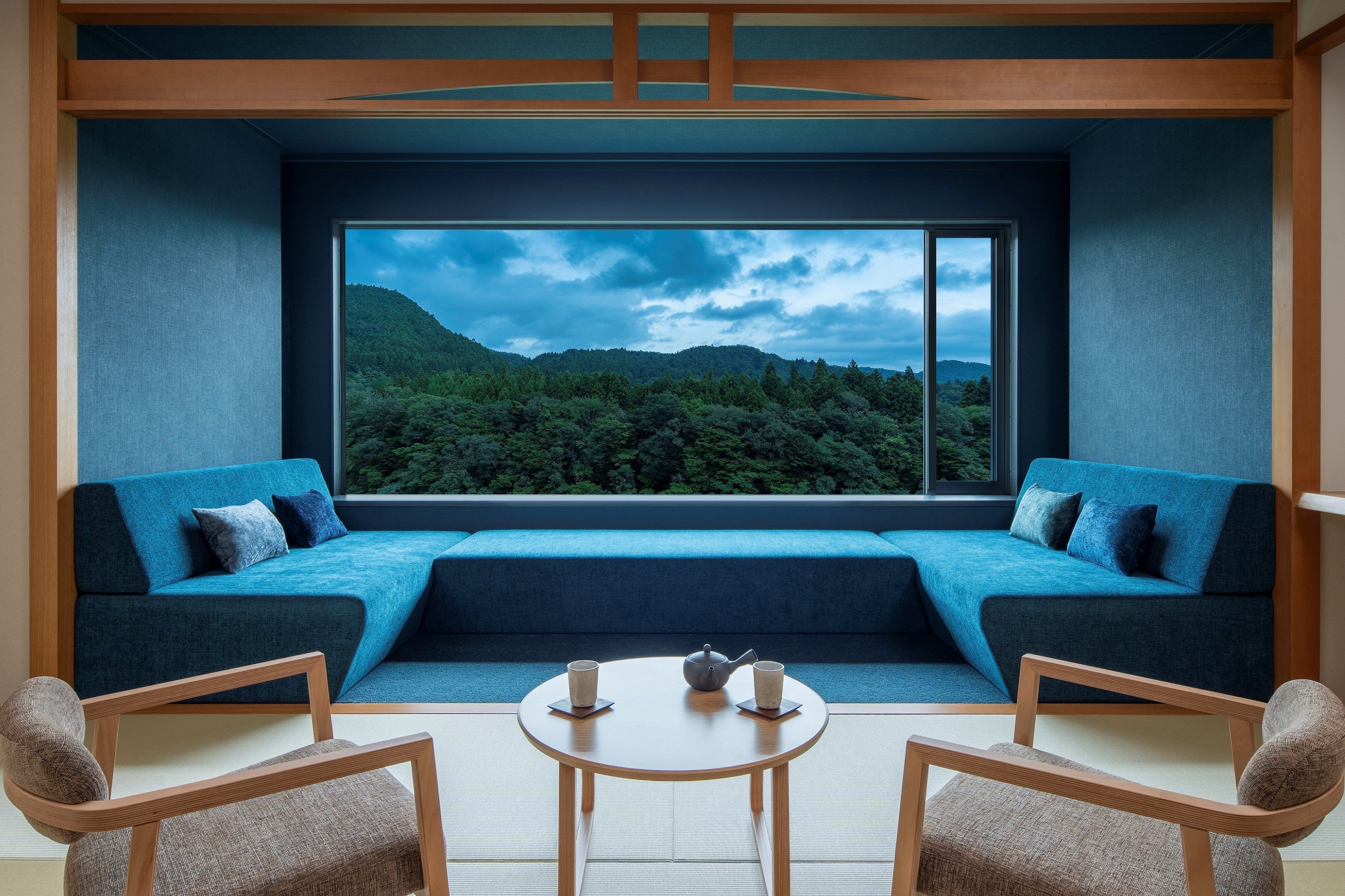「界」では、地域の文化に触れるご当地部屋を用意しています。界 秋保のご当地部屋は「紺碧の間」です。秋保温泉の景勝地である、名取川の峡谷「磊々峡(らいらいきょう)」が、かつて「紺碧の深淵」と表現されたことから着想を得ています(*2)。まるで紺碧色のフレームで切り取られたかのように、外に広がる四季の景色や渓流を楽しめます。