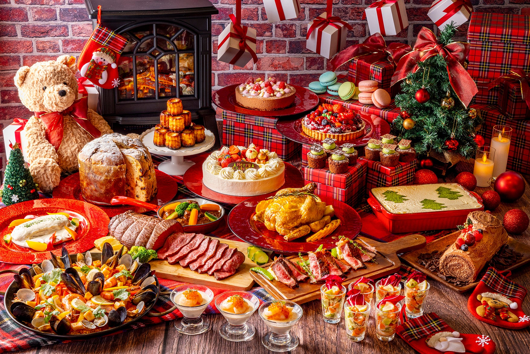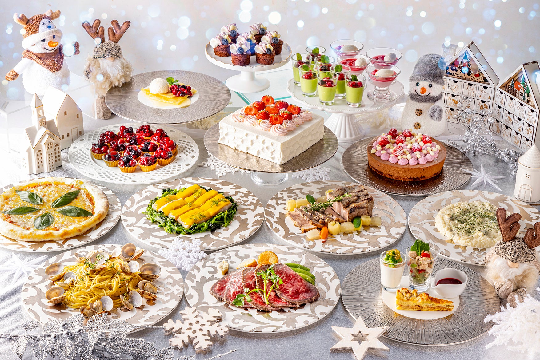 海老とホタテ貝のテリーヌ いくら添え シャンパンソース/パテドカンパーニュ/紅ズワイ蟹のキッシュ/サーモンとアヴォカドのタルタル/スモークターキー/モルタデッラハム&イタリアンサラミ盛り合わせ/チーズ盛り合わせ/野菜のバーニャカウダ14種 クリスマスバージョン/サラダバー/ローストポーク/ローストチキン オレンジソース/牛肉の赤ワイン煮込み/舌平目のボンファム/サーモンのパイ包み焼き 白ワインソース/海老と白身魚のフリット リヴォルノ風/自家製パスタのタリアテッレ/ラザニア/シーフードパエリア/ピッツァ(マルゲリータ・クアトロ・ジェノベーゼ)など