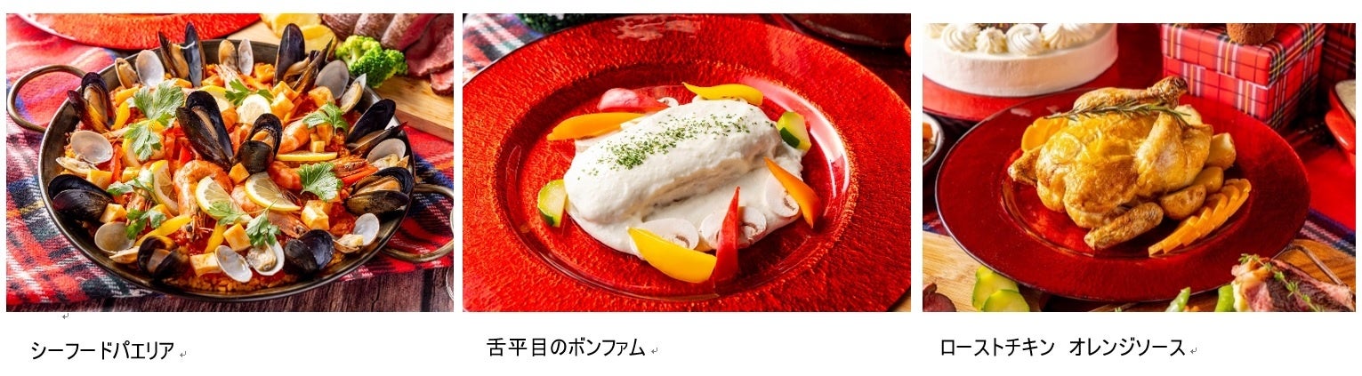 「クリスマススペシャルディナービュッフェ」では、肉質がきめ細かく、脂が口の中でとろける「千葉県産コウゴ牧場牛」を使用したステーキとローストビーフの2種をお客様の目の前でカッティングしてご提供いたします。クリスマスのごちそう「ローストチキン」はオレンジを煮詰めてフォンドボーを合わせた味わい深いソースとともにお召し上がりいただけます。また、キッチンで挽きたてのセモリナ粉で製麺したタリアテッレのペスカトーレやムール貝、あさり、いかをダイナミックに使ったシーフードパエリア、マルゲリータ・クアトロ・ジェノベーゼ3種のピッツァなどクリスマスのためにドレスアップしたイタリアンをメインに年齢問わずお楽しみいただけるお料理を多数ご用意しました。
