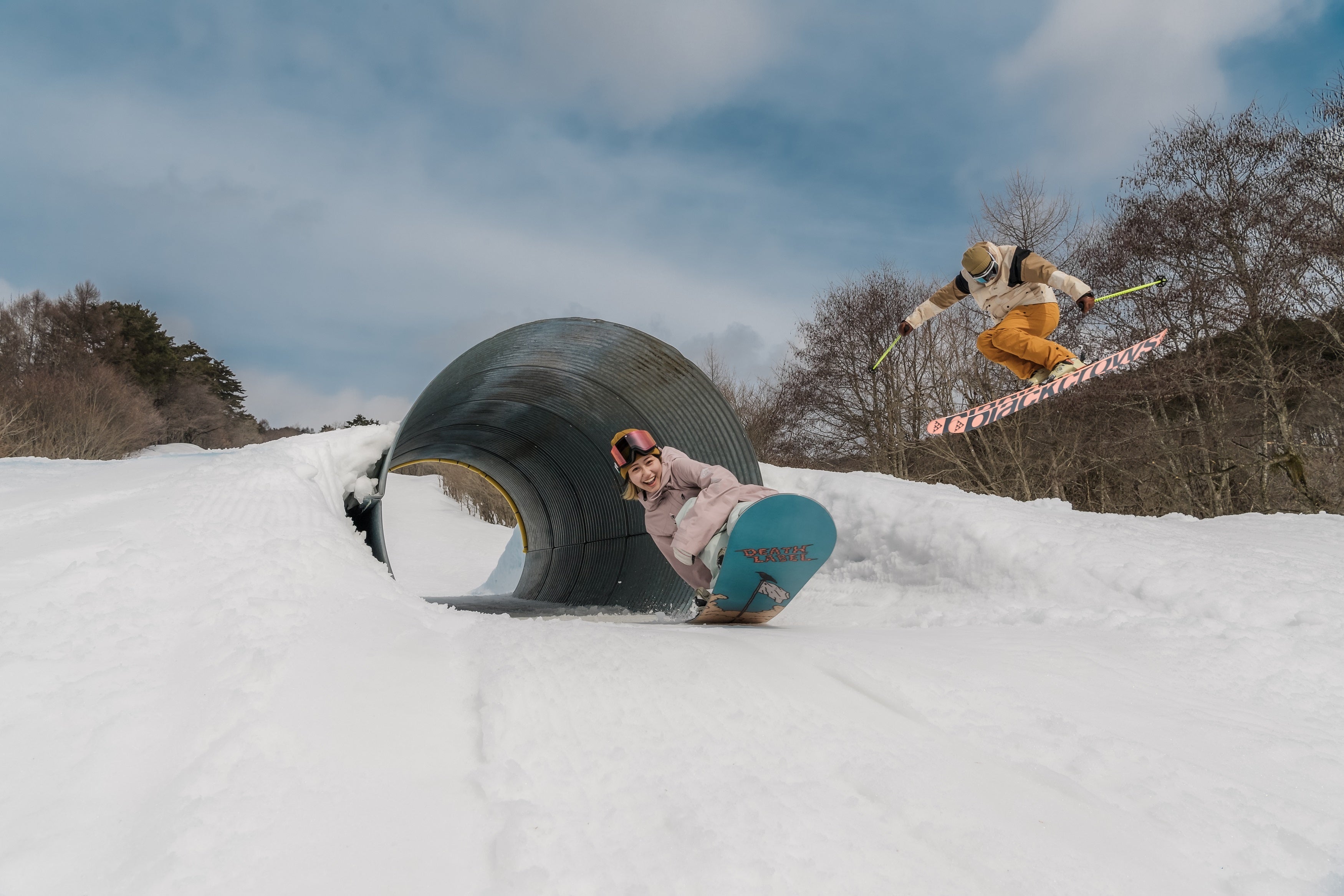 磐梯山と猪苗代湖を望む「南エリア」は、晴れた日には磐梯山と猪苗代湖を目の前に、気持ちよく滑ることのできるエリアです。中級レベルのロングコースや、初心者向けのスノーエスカレーター、テーマ別の異なるパークなどが設置され、様々な遊び方で楽しめます。