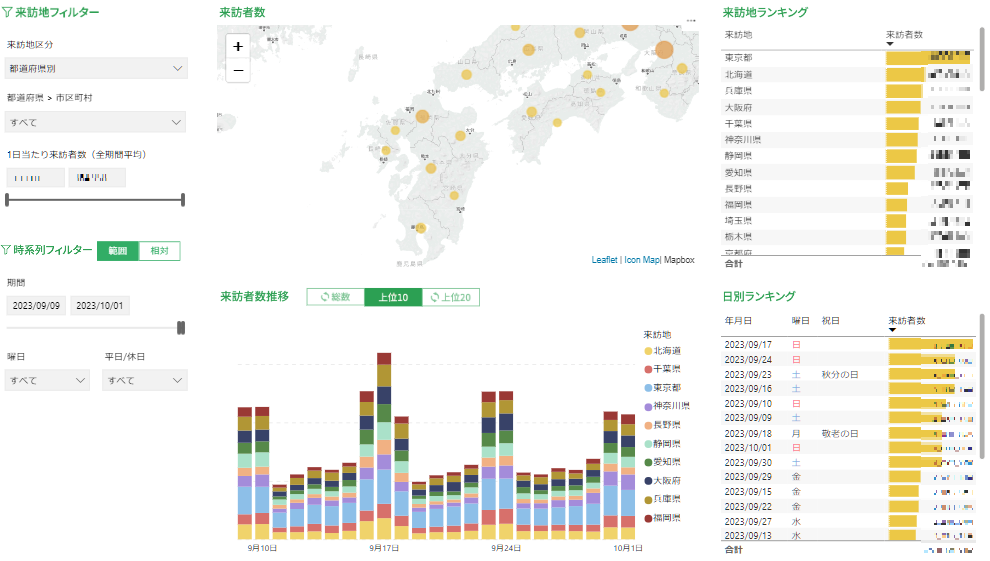 ・市区町村および観光スポット来訪者の行動特徴を準リアルタイム提供するWebサービスです。