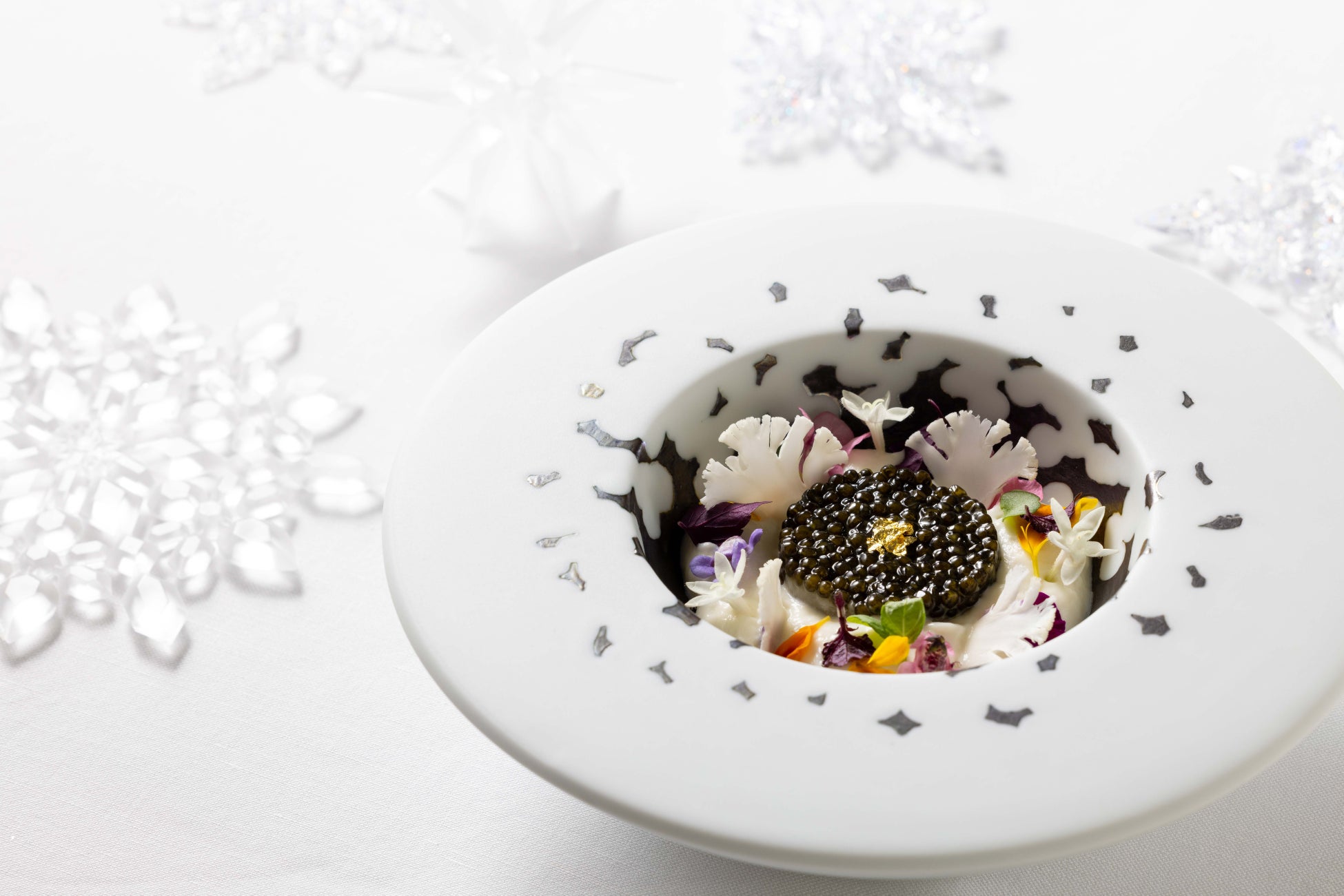 毛蟹やクエなど日本各地の冬の素材の持ち味を引き出し、伝統的なフレンチの手法を大切にしながらも、お客さまに驚きや感動を届ける創造性を織り込みました。あきたシャポンやキャビア、トリュフなどクリスマスの特別感を演出する素材も使用し、リースを模った前菜や銀世界をイメージしたデザートなど、一皿一皿に華やぐ季節を表現した限定コースです。