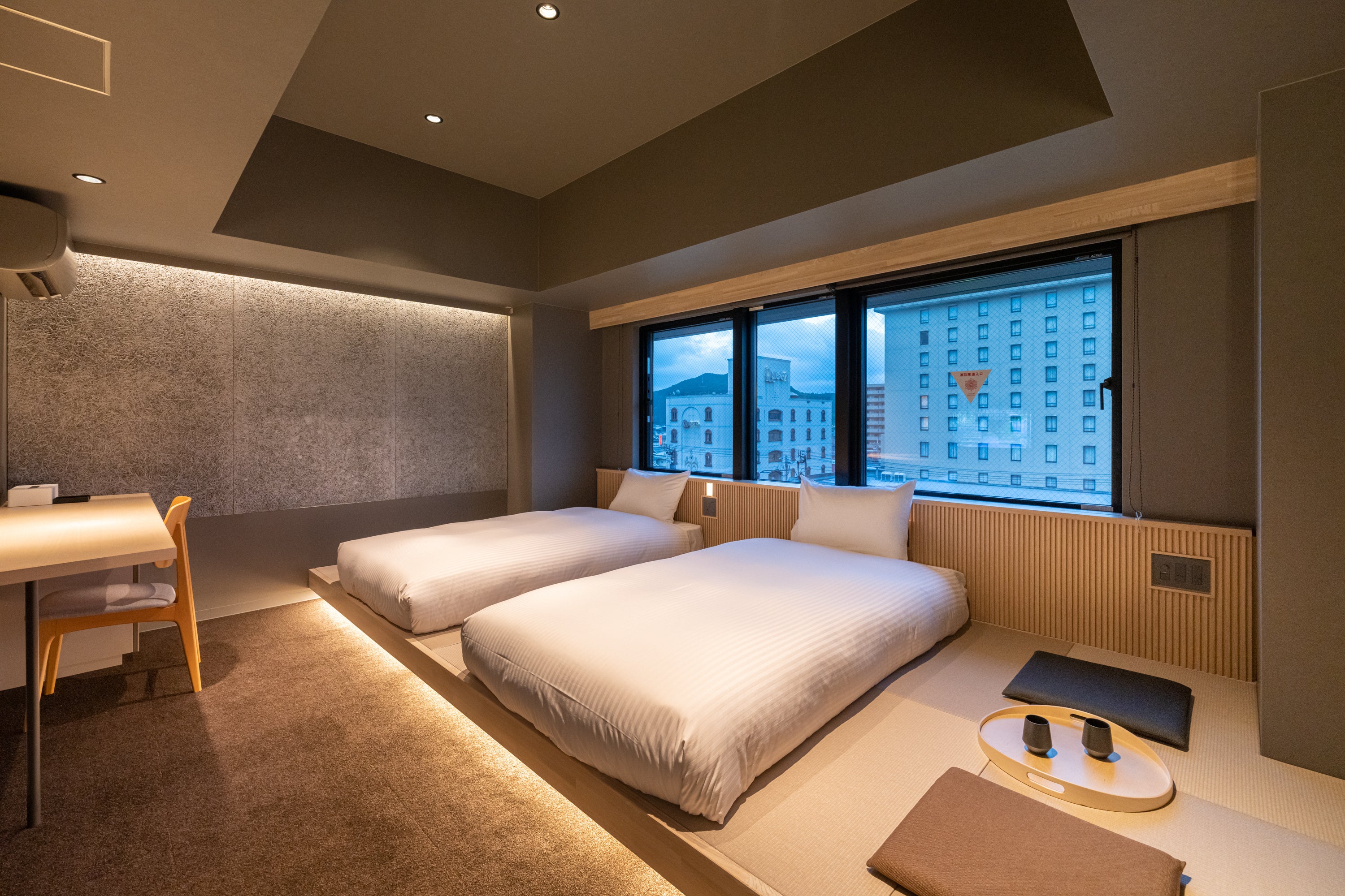小上がりに並んだツインベッドや、仕上げ材にこだわった質感が特徴の壁紙、木の素材をふんだんに使用したフロントカウンターなど、お客様の「印象に残るホテル」を目指しております。外観では、車の往来も多い繁華街の中で、喧騒から距離を置いて一息つけるよう、和風の庭をイメージした庭を設計しております。