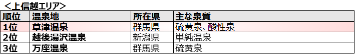 上信越エリアでは草津温泉が1位を堅守。天下の名湯と名高く、言わずもがな全国でも人気の温泉地です。2位は昨年3位の越後湯沢温泉。近年はスキーリゾート地としても発展を遂げています。