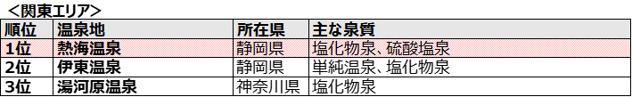 関西エリアでは、南紀白浜温泉、有馬温泉が1位2位をキープ。どちらも関西では知らない人はいないほど有名な温泉地です。3位の箕面温泉は昨年トップ10圏外から3位に急上昇。各地の旅行キャンペーンの影響で、例年のランキングと比べて動きが見られました。