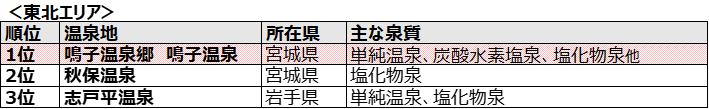 東北エリアも毎年恒例の3温泉地がランクイン。1位鳴子温泉郷 鳴子温泉は日本にある11種類の泉質のうち、9種類が揃うと言われています。昨年に引き続き2位の秋保温泉は「仙台の奥座敷」とも。1500年の歴史を持ち、古くより保養の地として親しまれています。