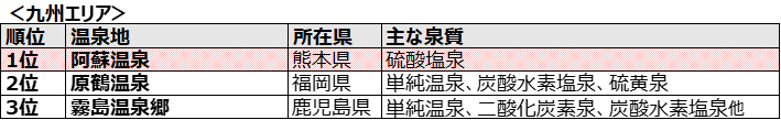 九州エリアは毎年変動が激しく、昨年とは異なる顔ぶれとなりました。激戦を制したのは阿蘇温泉郷。日本有数の湧出量と源泉量を誇り、各温泉で異なる源泉・泉質が楽しめます。2位は筑後川のほとりに佇む原鶴温泉。とろとろした柔らかな泉質で近年人気上昇中です。
