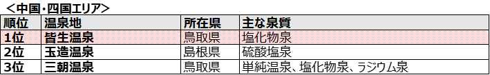 中国・四国エリア、不動の1位は皆生温泉。水木しげるロードや境港などの観光地も多いほか、温泉は保温保湿効果が高く「健康と美肌の湯」とも言われています。2位の玉造温泉は昨年5位からランクアップ。美肌の湯としても定評があります。