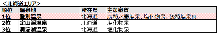 北海道エリア上位3温泉地はここ最近のランキングではおなじみの顔ぶれとなりましたが、1位に入れ替わりがありました。今年王座を手にした登別温泉は乳白色の硫黄泉が有名で、温泉らしい温泉が楽しめます。