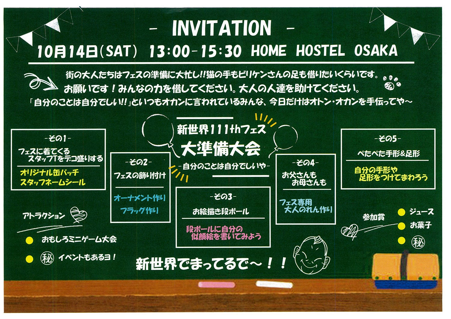 そんな中、大の大人たちが猫の手もビリケンさんの足も借りたいほどてんてこ舞いになっている状態を見て、いつも「自分の事は自分でしいや!」とオカンに言われている新世界キッズ達が「僕たち!私たちが!準備を手伝うわ!」と、フェス開催準備のお手伝いをしてくれるイベント『新世界111thフェス大準備大会-自分のことは自分でしいや!!-』の開催が決定いたしました。