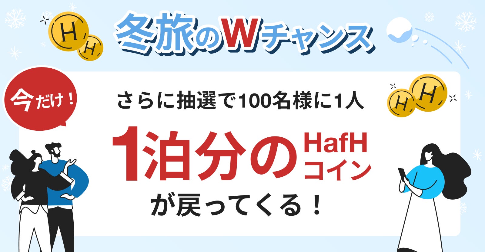 「HafHでGO!GO!冬旅タイムセール」&Wチャンスで100人に1人1泊分のコインバック