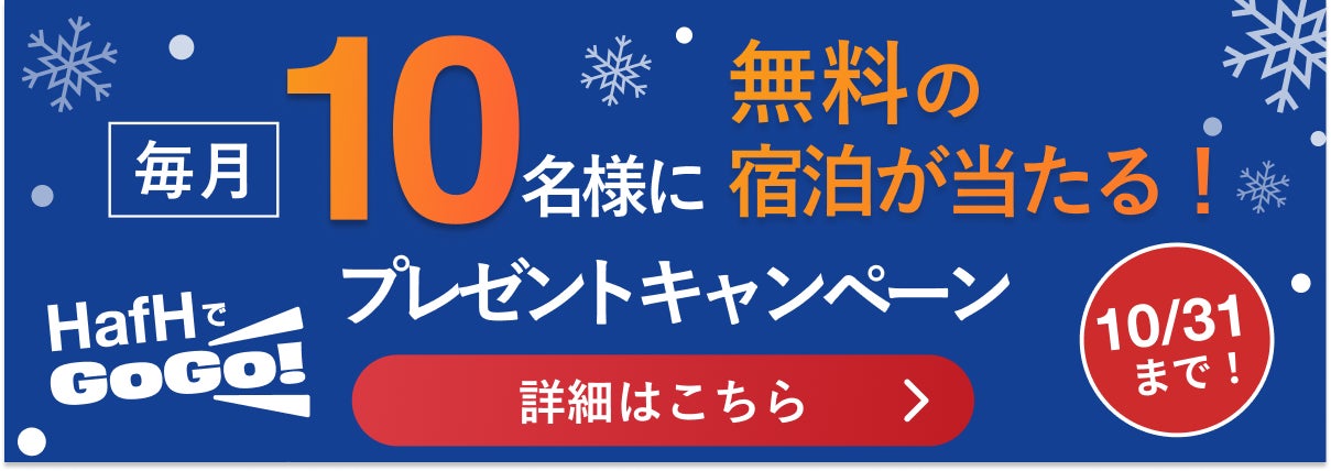【HafHに初めてご登録される方対象】さらに!「毎月10名様に無料宿泊権が当たる!HafHでGO!GO!プレゼントキャンペーン」開催