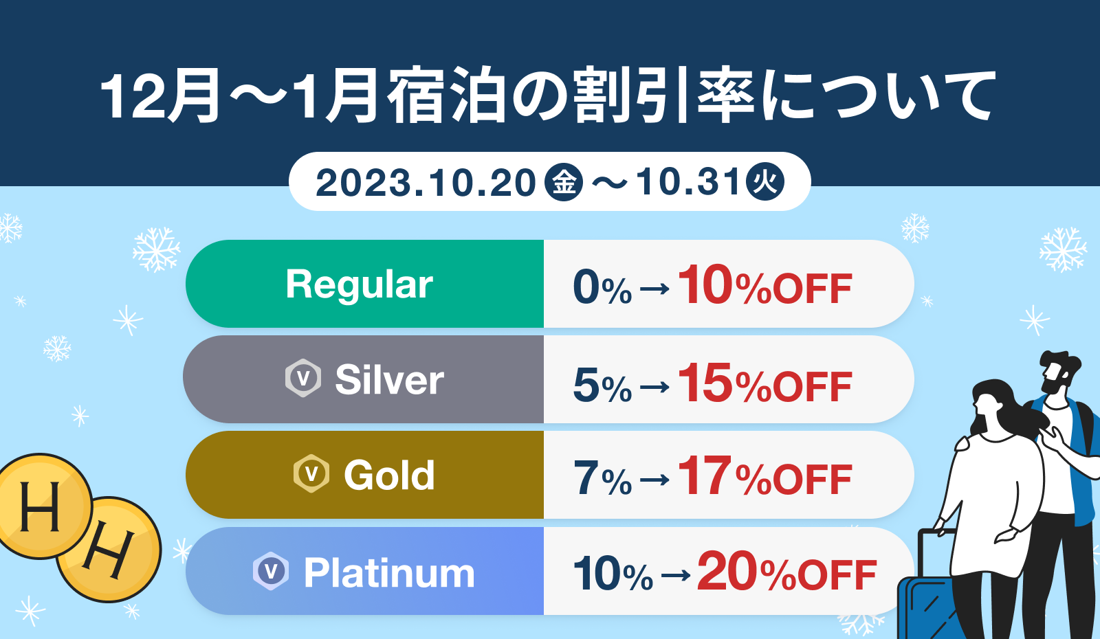 10月20日(金)00:00 〜 10月31日(火)23:59の期間限定で、全ての施設で12月〜1月の宿泊予約が通常よりさらに10%OFFになり、VIPステータスがPlatinumの方であればさらに20%OFFになります。