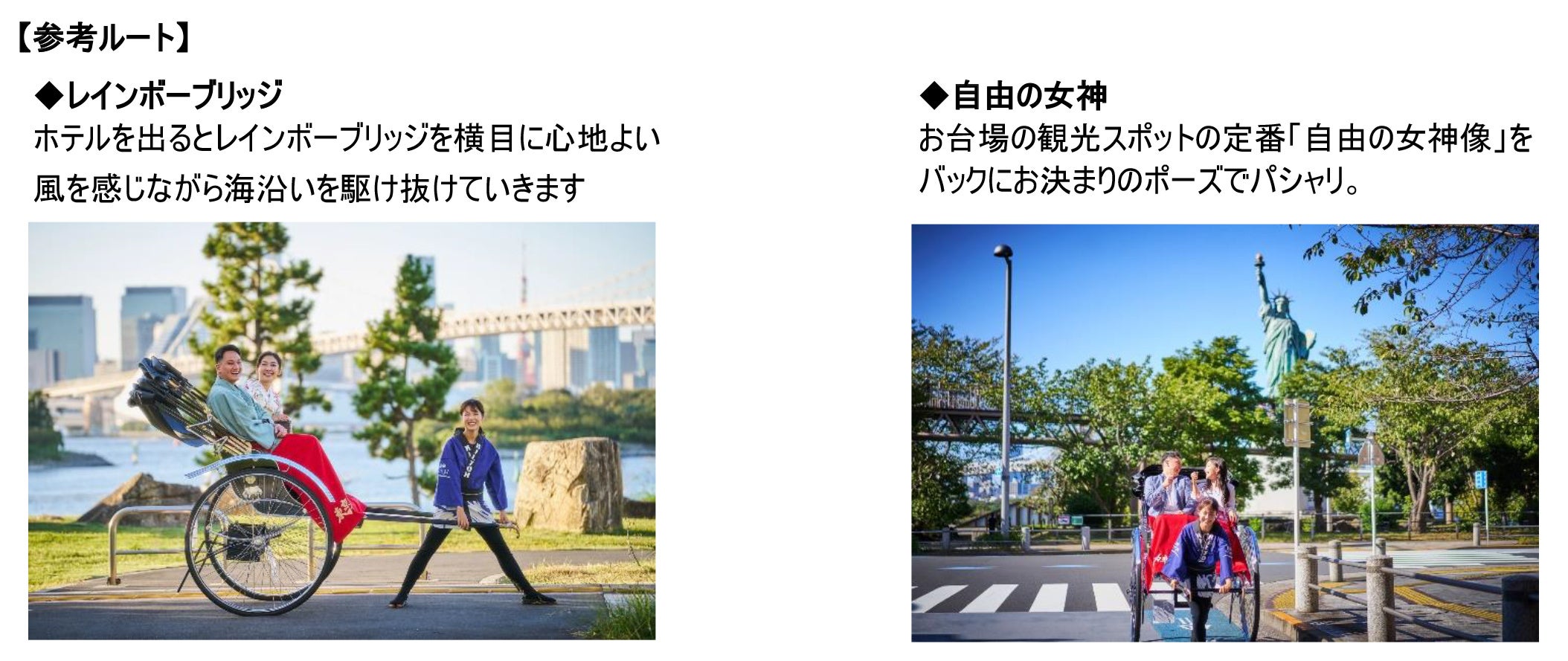 レインボーブリッジや東京タワー®など都内屈指の絶景を臨み、都心にいながらリゾート気分が味わえるヒルトン東京お台場では、ホテル初の試みとしてエグゼクティブルーム・スイートルームをご予約の宿泊者を対象に、10月20日(金)~11月26日(日)の金・土・日・祝日限定(計19日間)で、日本の伝統的な乗り物である人力車でお台場エリアを無料で運行いたします。明治から大正・昭和初期まで移動手段として活躍してきた人力車は、現在では多くの観光地で見かけます。本イベントは観光スポットを多く有するお台場エリアにも人力車を走らせたいというスタッフたちの熱い想いから実現いたしました。人力車は東京・浅草を拠点に活動し、女性の俥夫も多く有する「東京力車(とうきょうりきしゃ)」ご協力のもとホテル1Fのエントランスより出発いたします。ホテルを出発すると、お台場のシンボルであるレインボーブリッジを横目に颯爽と海沿いを駆け抜け、自由の女神を見上げながらフジテレビを通る約15分間の体験となります。また、ホテル内にある「着物レンタルVASARA」で着物をレンタル(別途料金)して乗車することもできるので、お台場の観光スポットを背景に人力車と着物で記念撮影をすることも可能です。