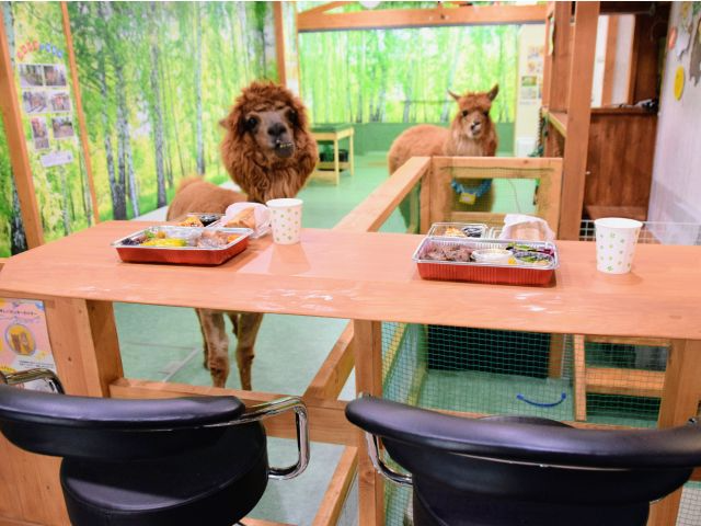 アルパカを眺められるカウンターにて食事ができますので、至近距離でアルパカを眺めることができます。もちろん、食事時間とは別にふれあいの時間もご用意しております。