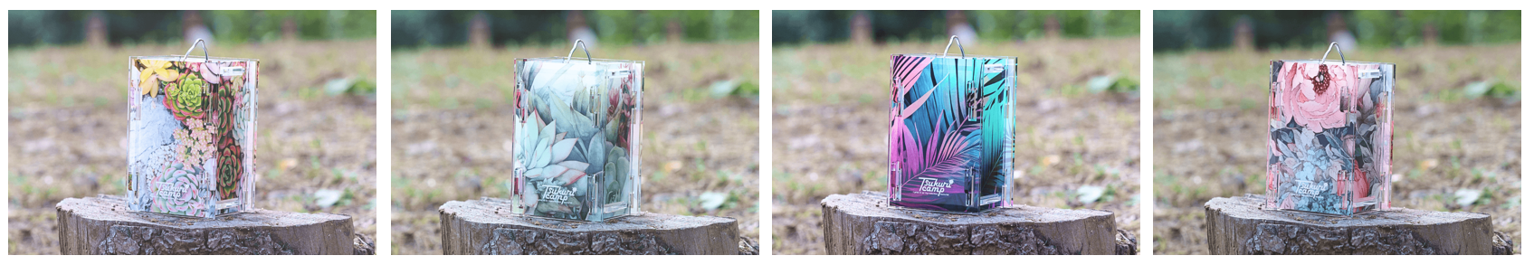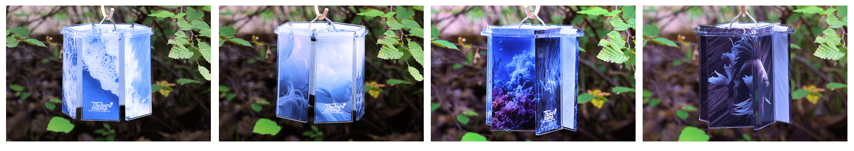 材料には、再生アクリル樹板 「リアライトRE」を使用しており、透過性のあるアクリルにプリントを施すことでやさしい光と美しいデザインがアウトドアシーンを彩ります。