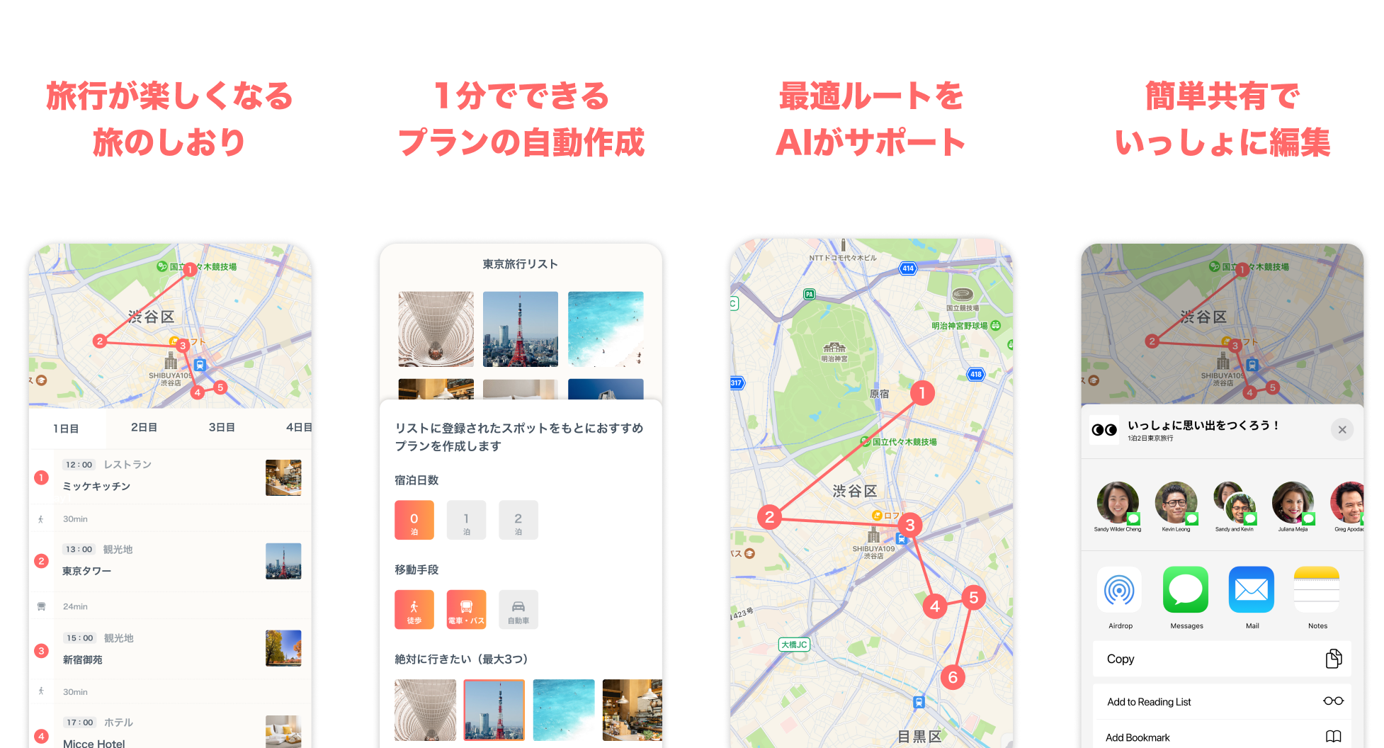 ミッケアプリに行きたい場所を登録し、あとは旅行の基本情報(何泊何日、移動手段)を入力するだけ。わずか1分で理想の旅行プランができます。友達や家族と旅行の計画を立てる楽しさや時間を大切に保ちつつ、プランニングの難しい部分を効率的にサポートします。行きたい場所のリストは家族や友達と簡単に共有することができ、行きたい場所をお互いに登録できます。ユーザーの希望に応じた最適な旅行プランを提案し、より素晴らしい旅行体験をサポートします。