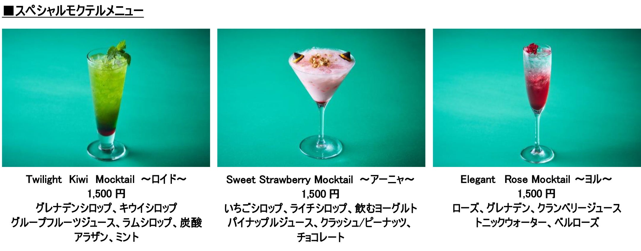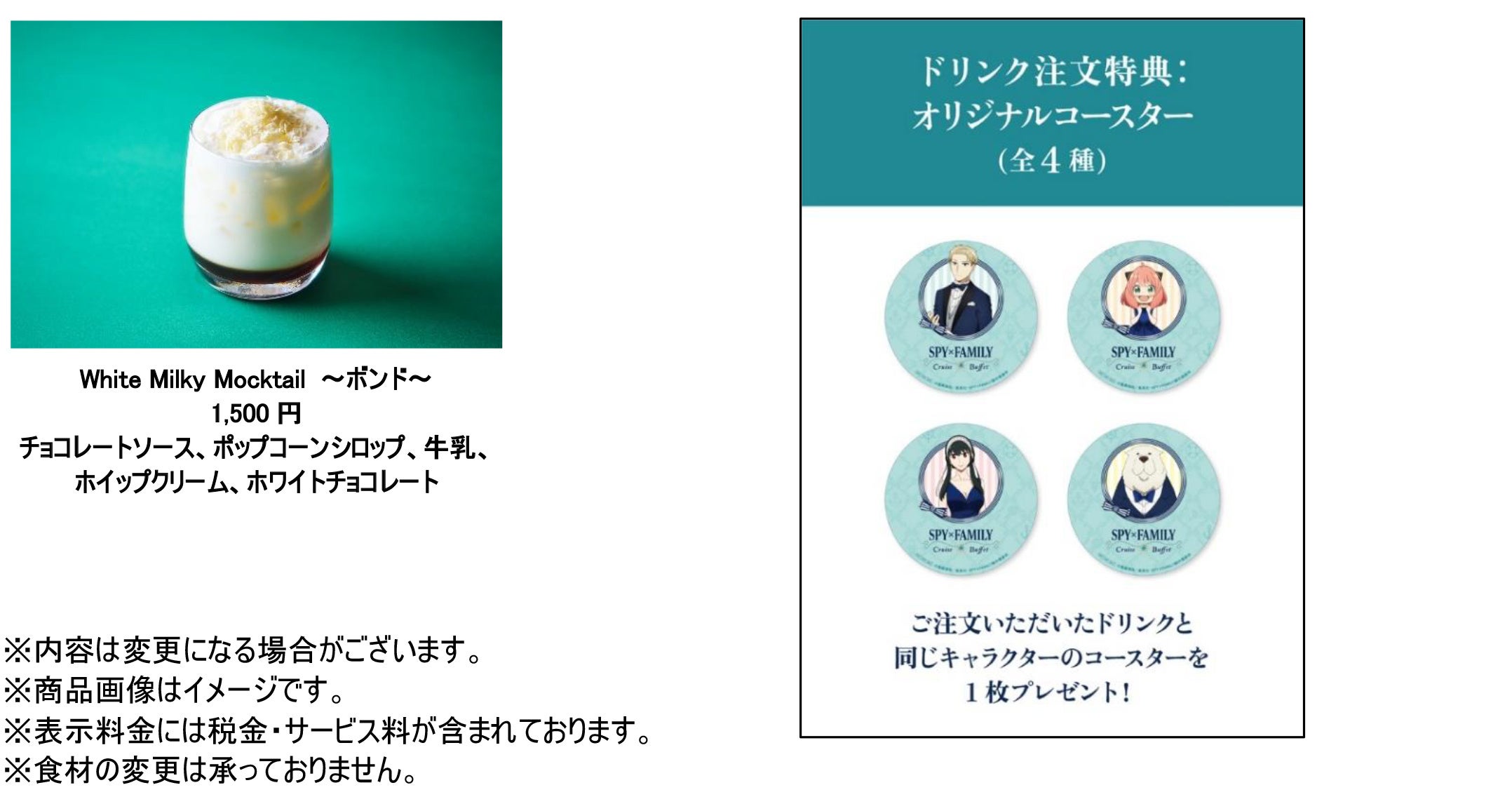 TVアニメ『SPY×FAMILY』のフォージャー家「ロイド」「アーニャ」「ヨル」「ボンド」をイメージしたビュッフェをお楽しみいただけます。また、キャラクターをイメージしたスペシャルモクテルも追加でご注文が可能です。さらに今回のビュッフェに合わせ、会場にてオリジナルグッズも販売予定です。