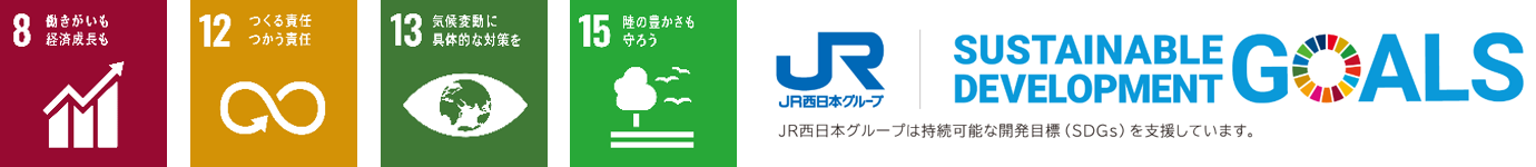 JR西日本ホテルズは、持続可能な開発目標(SDGs)を持ち、地域と共に、お客様一人ひとりの豊かな人生を広げます。今回ご案内の取り組みは、SDGs目標の8番、12番、13番、15番に貢献するものと考えています。