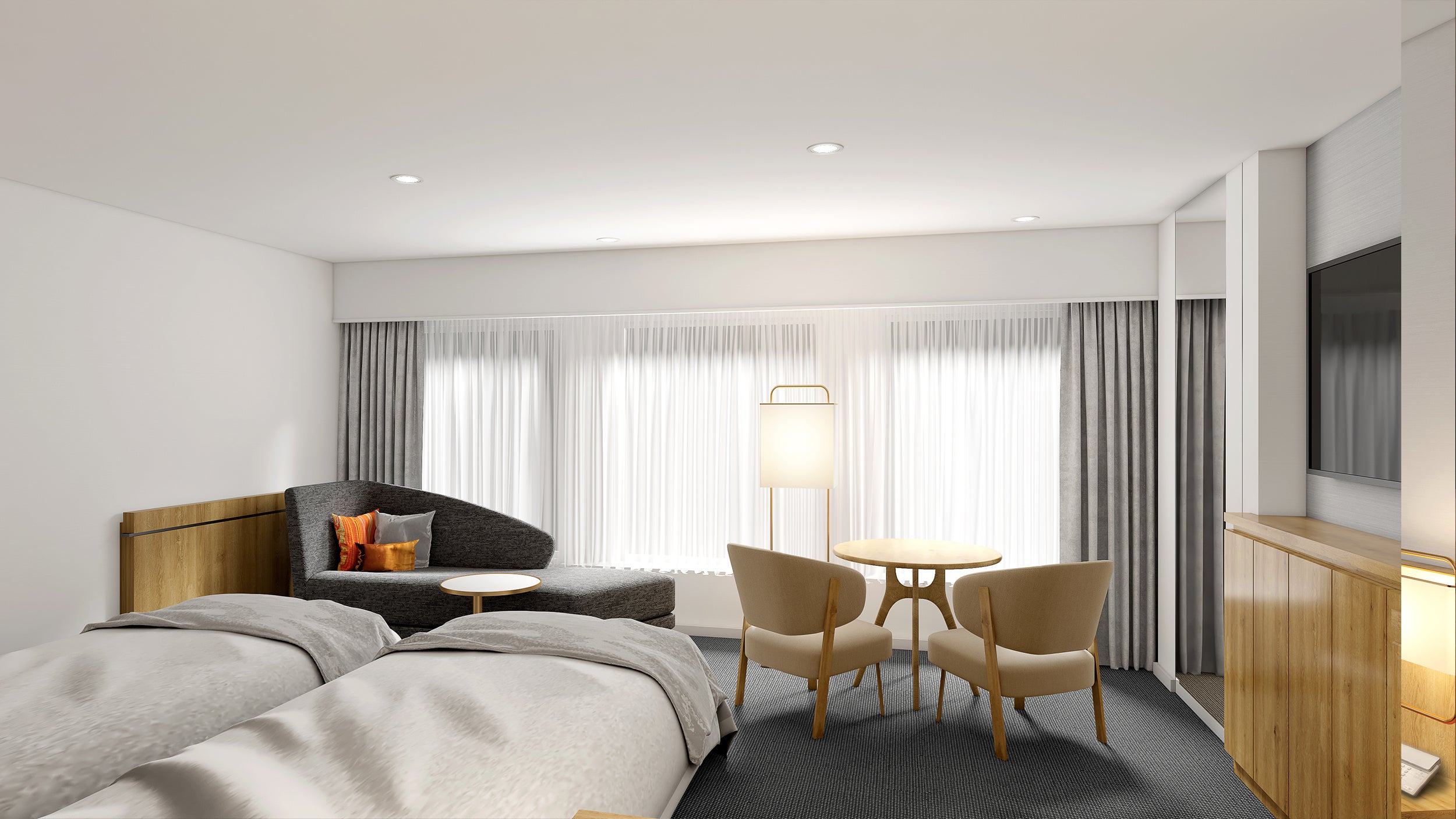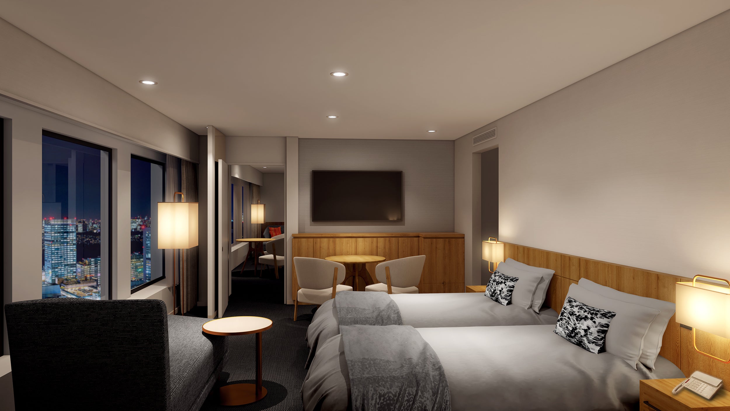 このたび改装する本館32-34階の客室は、国内外のあらゆるお客様に親しまれ、明るく開放的な雰囲気をつくる、「家族・グループが団欒を楽しむ」「夫婦が夜景を楽しみながら“優遊(ゆうゆう)”と心のまま過ごす」「仕事の緊張から解放された憩いの時を感じる」などの要素が融けあう空間をコンセプトにデザインいたしました。高層階の眺望と広い窓面を活かした開放感、ラグジュアリー感あふれるレイアウト、コネクティングルームの新設、ツイン・ダブルのベッドアレンジにより様々なお客様の要望に柔軟に対応いたします。また、1室単体でのご利用も可能で、洗い場付きのバスルームとトイレを分離し国内利用者にも好まれるような機能性を備えています。