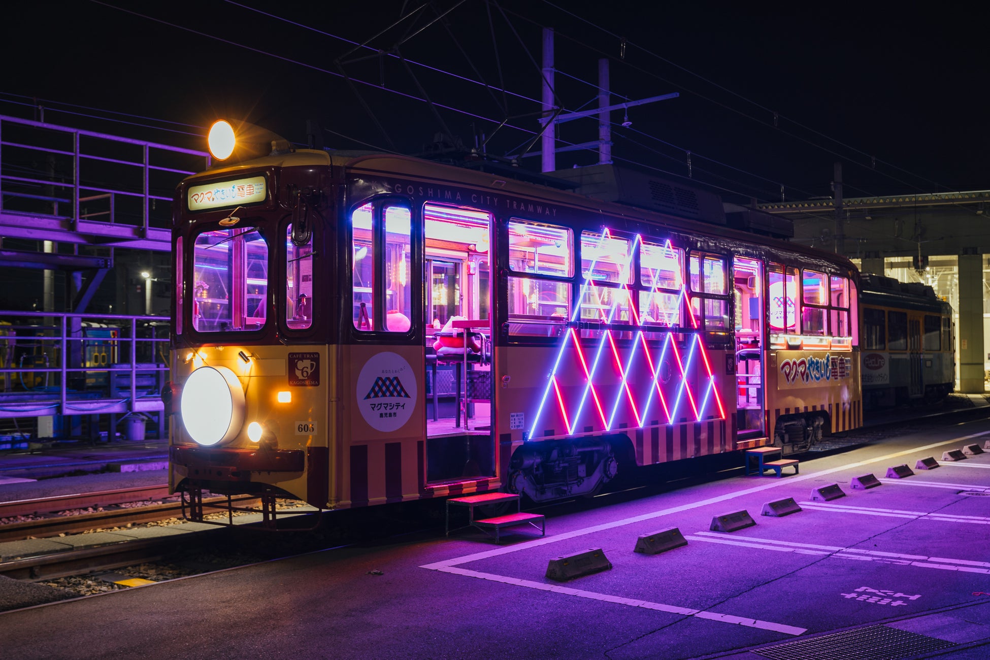 「マグマやきいも電⾞」は電⾞の⾞内で、4種の焼き芋を⾷べ⽐べながら⿅児島市内を回遊できる期間限定の体験型路⾯電⾞です。外観には、⿅児島市のシンボルマーク「マグマシティ」をモチーフにした光り輝くLED装飾を施し、内観も⾚と⻘のラインが⾛るイルミネーション仕様となっています。交通局から出発し、⿅児島中央駅から天⽂館、市役所前と⿅児島の中⼼地を通るルートで⾛⾏、参加者はガイドによる案内を聞きながら市内回遊を楽しむことができます。電⾞内では⿅児島産の4種のほくほくの焼き芋を⾷べ⽐べができるサツマイモの全国生産量1位を誇る鹿児島県ならではの企画です。昨年開催時には、定員の6倍(2,000名以上)の応募があり、鹿児島における新たな体験型コンテンツとして注目を集めました。今年度の「マグマやきいも電車」の実施内容公開および参加者の応募受付開始は2023年12月を予定しています。