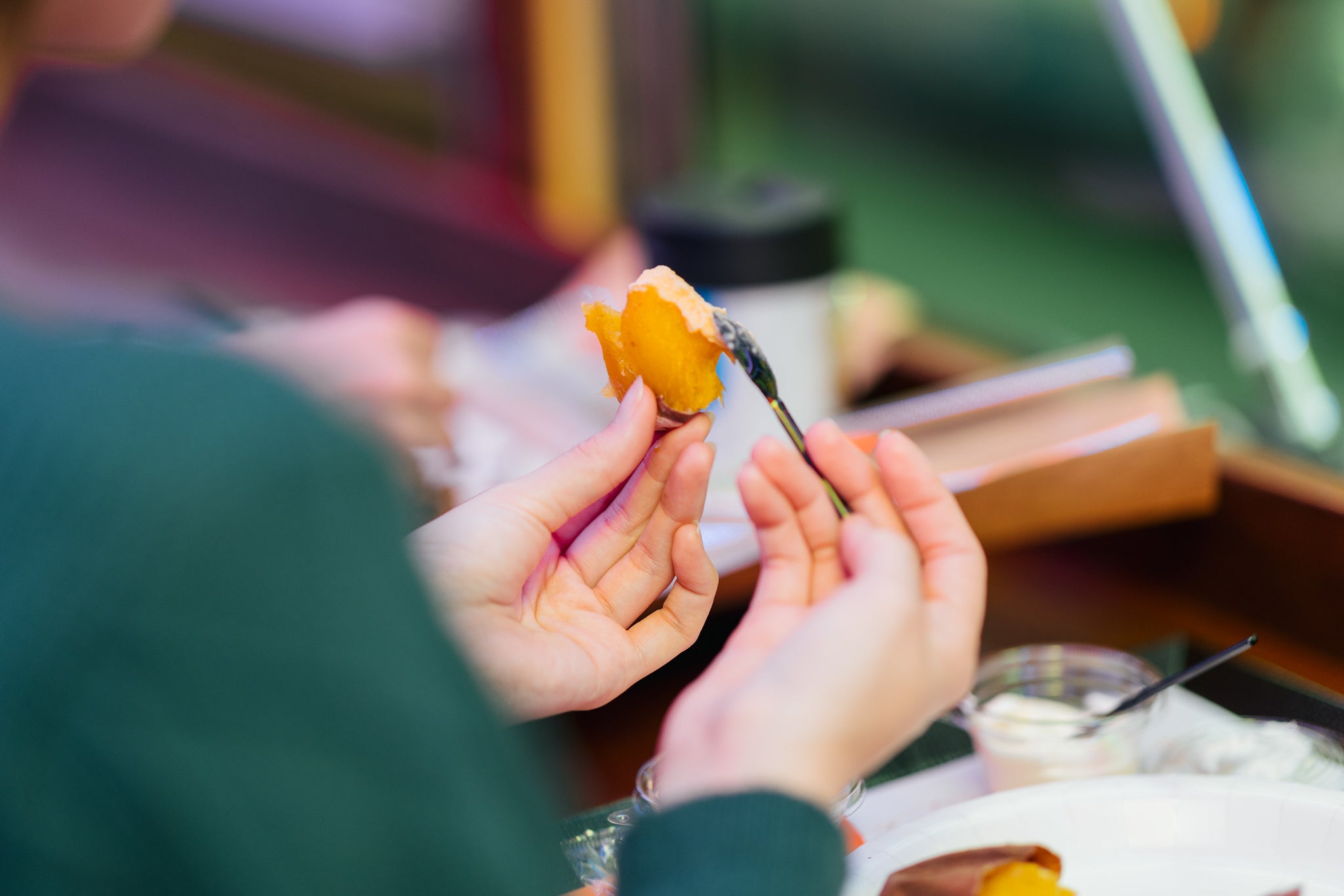 ▲4種類のやきいもを運行コースに合わせて提供。オリジナルのディップソースも好評。