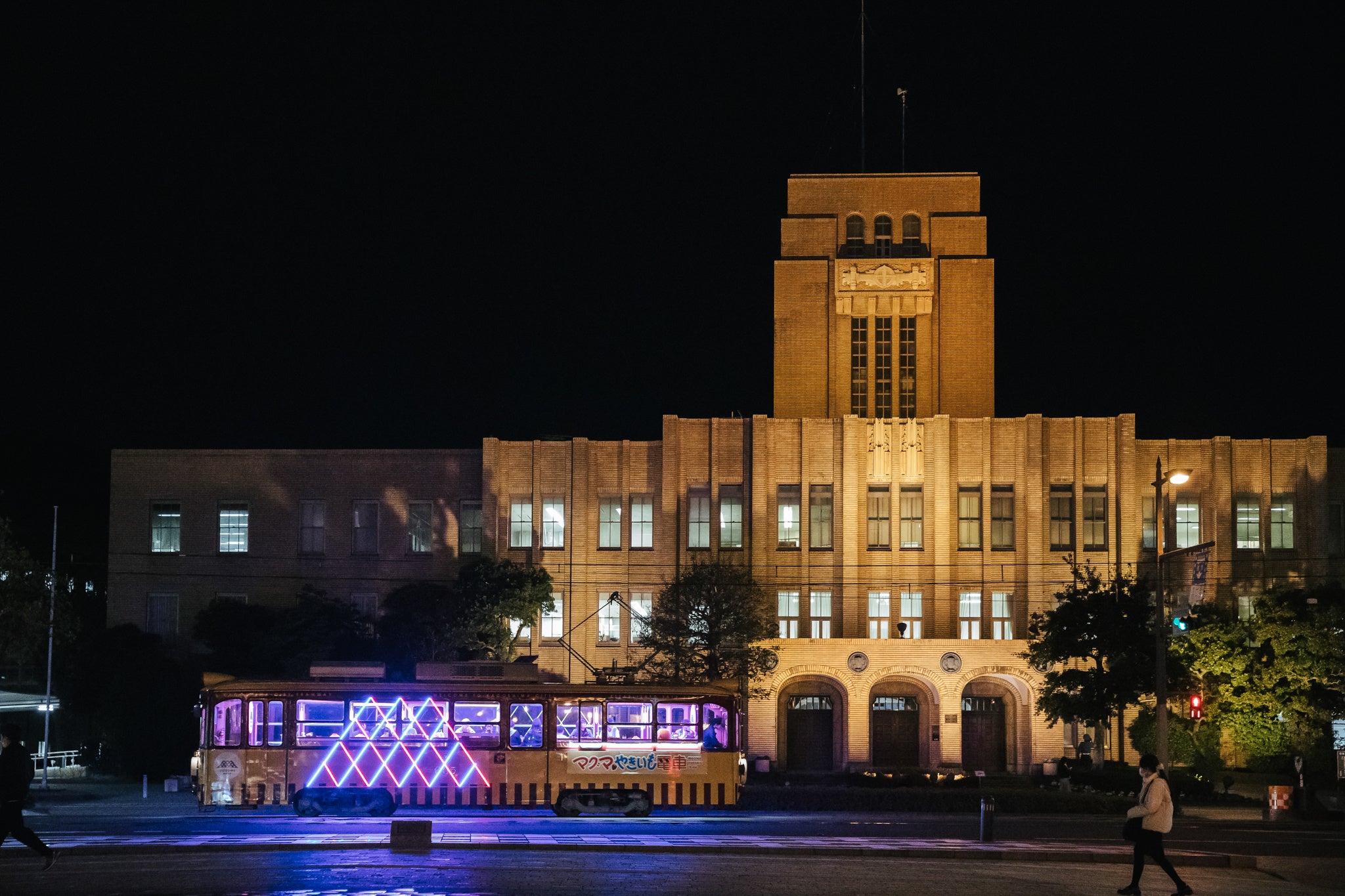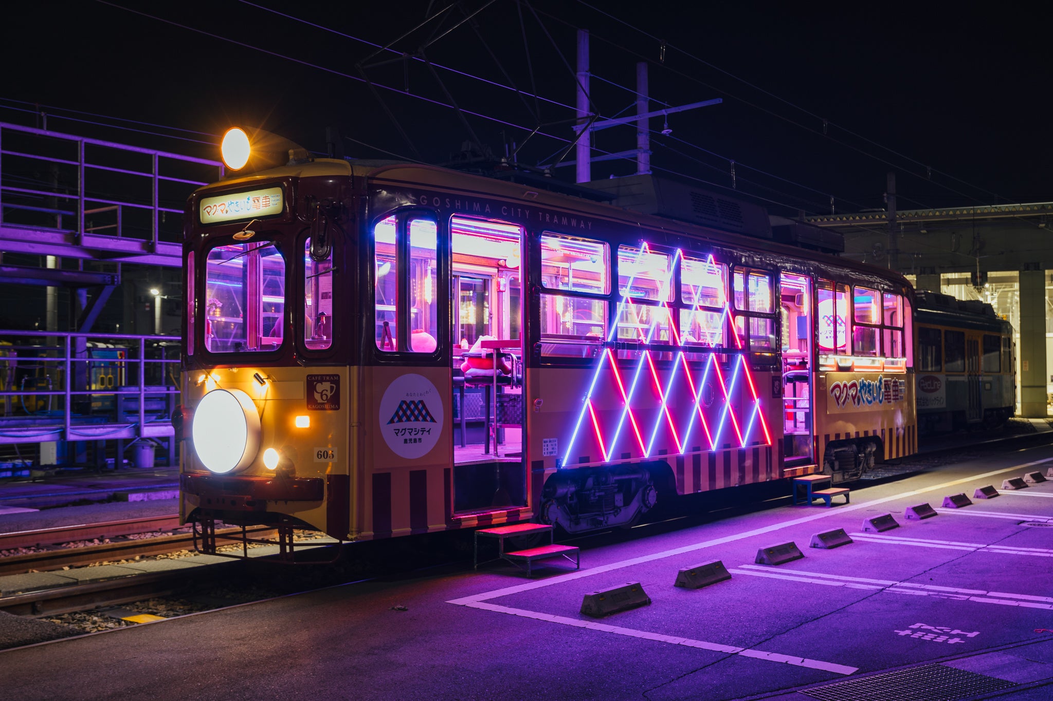 ▲マグマシティのロゴをイメージしたLEDで光り輝く特別装飾の路面電車で、市内を回遊。