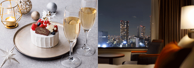 夜景を望む客室で大切な人と二人きりで過ごすクリスマス・ナイトや、お部屋で楽しむおこもり・クリスマス女子会など、ニーズに合わせた客室タイプが選べます。宿泊限定のホテルメイドケーキとシャンパンを満喫しながらクリスマスステイをお楽しみください。