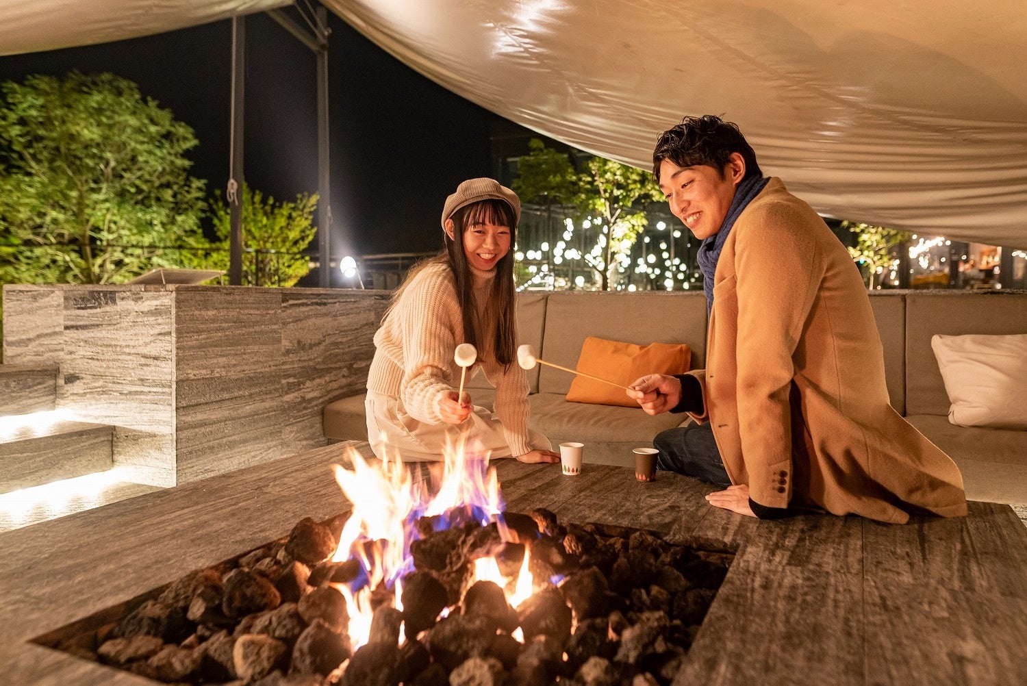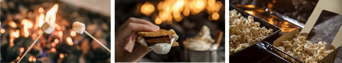 「焚火のリビング」では、焚き火を囲みながら味わうスイーツをご用意。焚き火で炙ったフワフワのマシュマロを、KUROBARオリジナルナッツや塩チョコレートと一緒にクラッカーに挟んでお召し上がりいただく人気デザート「スモア」。焚き火で炙る出来たてポップコーンをお楽しみいただけます。