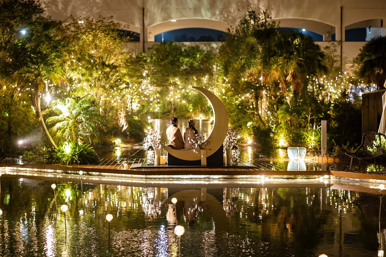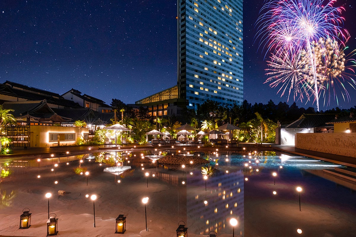 水面に映るあたたかな光が幻想的な空間を演出するガーデンプール前には、昨年新たなフォトスポットとして誕生した三日月型のオブジェが今年も登場。さらに、クリスマスを含む「The DELICIOUS HOLIDAY WEEK」やカウントダウン&元日に実施する打ち上げ花火が、ガーデンエリアにより華やかな彩りを添えます。