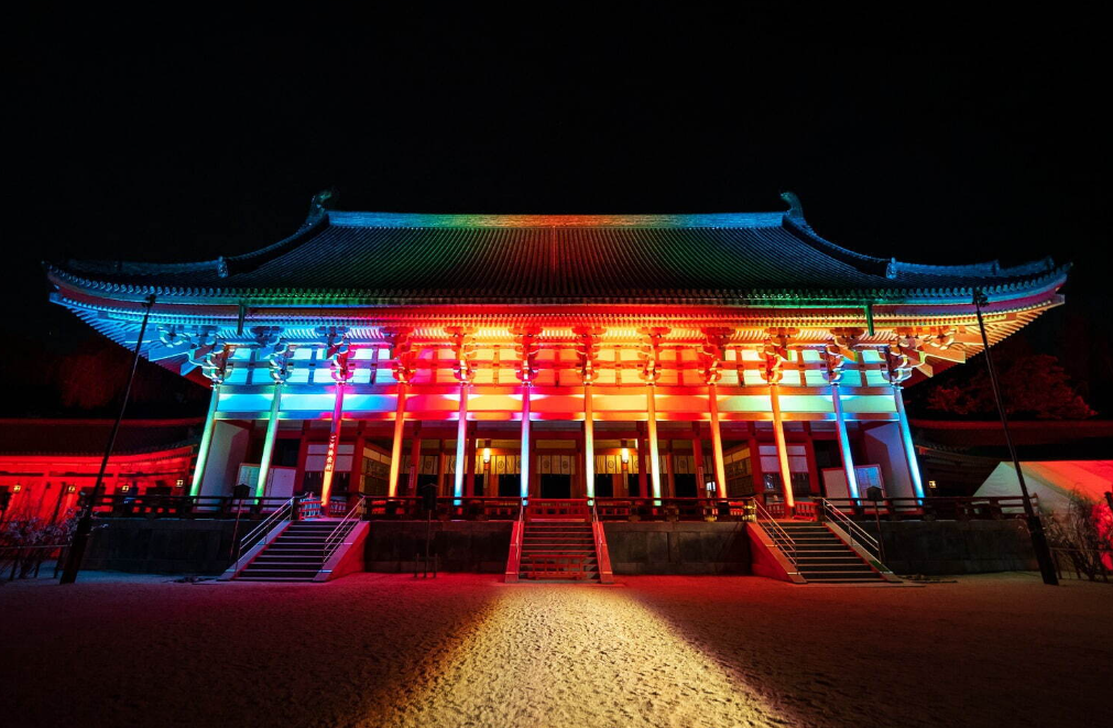 重要文化財・大極殿を彩るのは、光のインタラクティブアート『光の回廊』。通常は立ち入ることができない大極殿の長い歩廊を、カラフルな提灯の光が照らします。連動タイプの『NAKEDディスタンス提灯®』を所定の場所に置くと、回廊のプロジェクションマッピングに変化が起こるインタラクティブアートも。