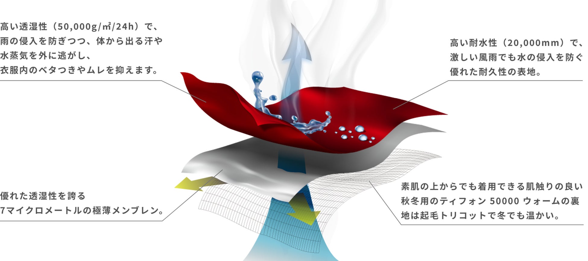 ティフォンは、一般的なレインウェアの透湿性(10,000〜30,000g/㎡/24h)の2倍前後の数値、50,000g/㎡/24hを実現した防水透湿素材です。