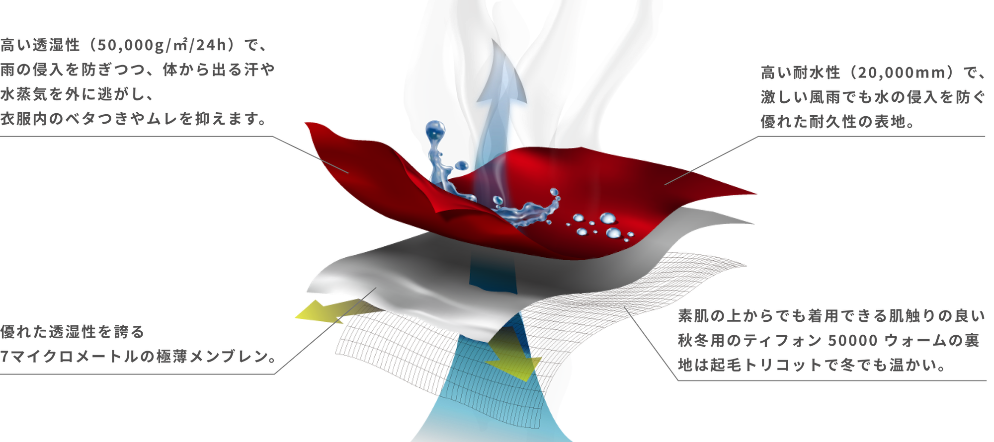 ティフォンは、一般的なレインウェアの透湿性(10,000〜30,000g/㎡/24h)の2倍前後の数値、50,000g/㎡/24hを実現した防水透湿素材です。