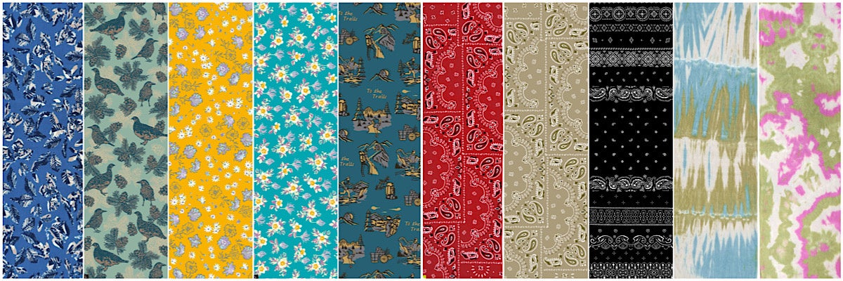 バンダナ柄やタイダイ染めも自然に馴染むカラーや、滝・苔・水など、自然にまつわる色味と組み合わせで作成しています。